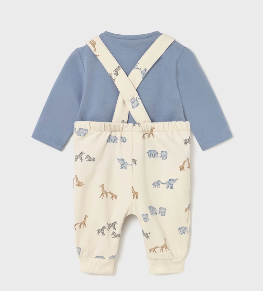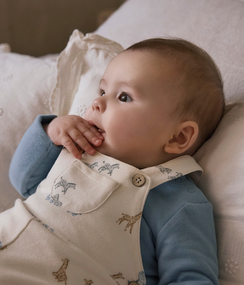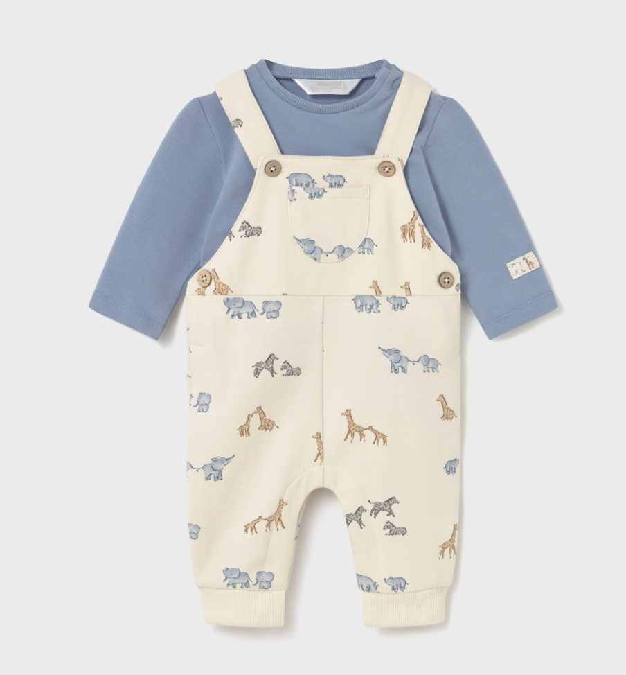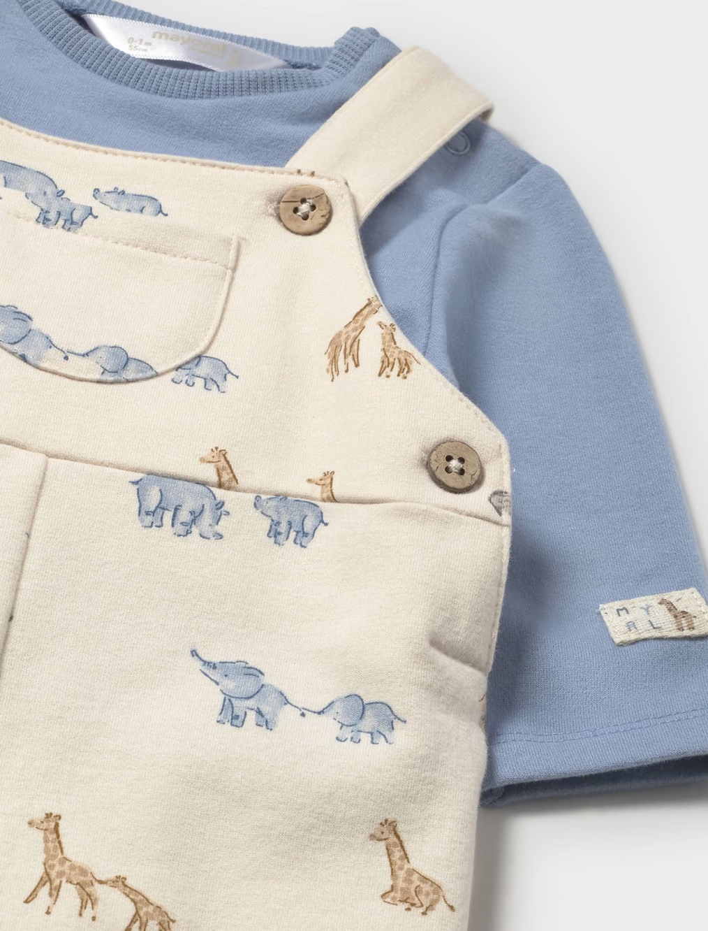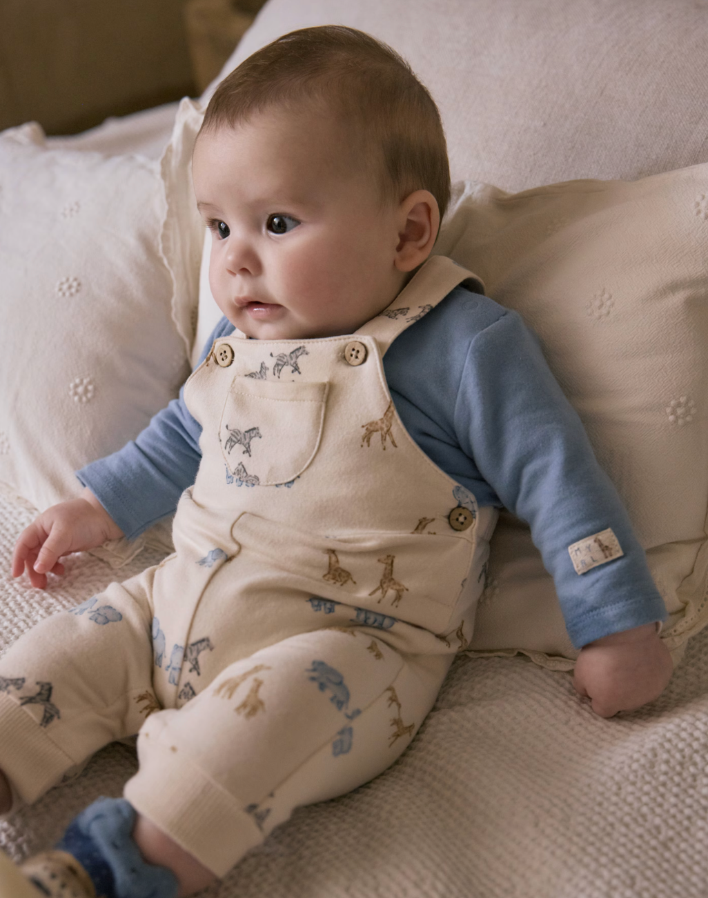 Crafted from soft organic cotton, this Baby Safari Overalls and T-Shirt set offers gentle comfort for your newborn baby boy. The brushed cotton long-sleeved top features a classic round neckline and convenient snaps at the shoulders to simplify dressing. Complementing the top, the cream-colored overalls are adorned with a charming safari print that adds a playful touch to the outfit. Adjustable buttons on the overall straps ensure a perfect fit as your baby grows, while a sweet front pocket adds a subtle decorative detail. Practical buttons at the hips make diaper changes and dressing effortless. This carefully designed set combines comfort, functionality, and adorable style for everyday wear.