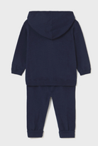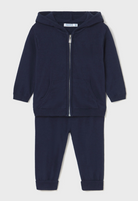 This two-piece tracksuit set combines comfort and functionality with a sophisticated design. The long-sleeved, woven knit sweatshirt features a hooded collar and a front central zip fastening for easy wear and adjustable coverage. A practical front pocket adds convenience, while the elasticated waistband with an adjustable drawstring on the pants ensures a secure, customized fit. Crafted from soft knitted fabric, this unisex set offers excellent breathability and flexibility, making it suitable for various activities and body types. Its neutral navy tone and minimalist silhouette provide versatile style options for everyday wear.
