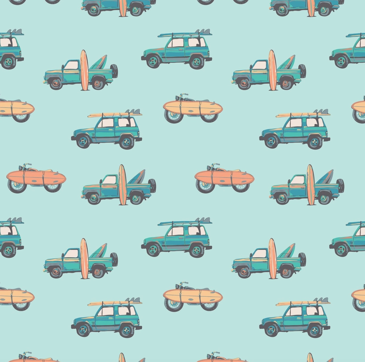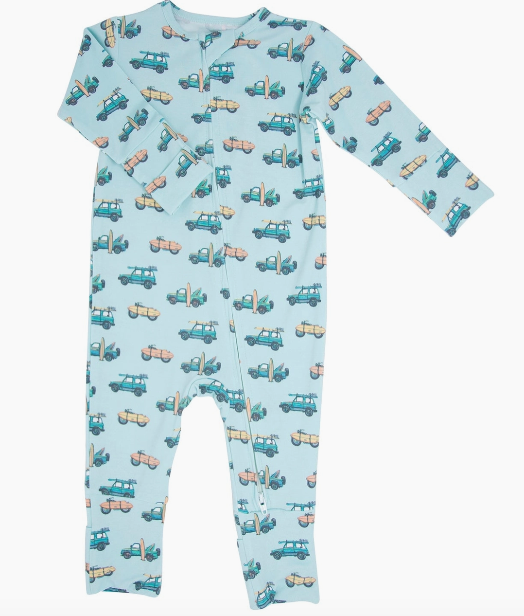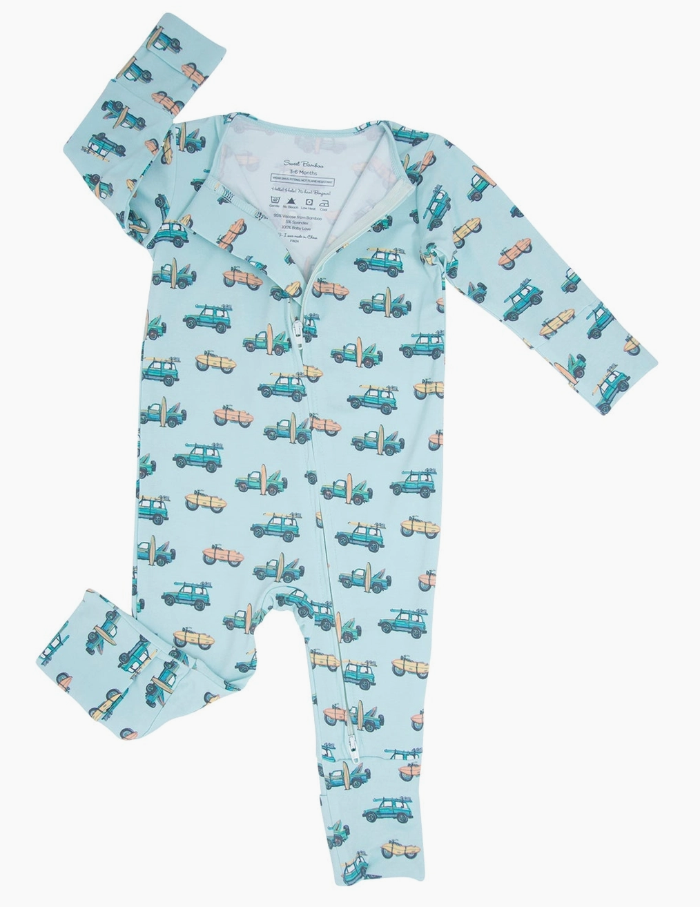 A blue and white bamboo romper with palm leaf patterns, featuring a 2-way zipper and fold-over handcuffs.