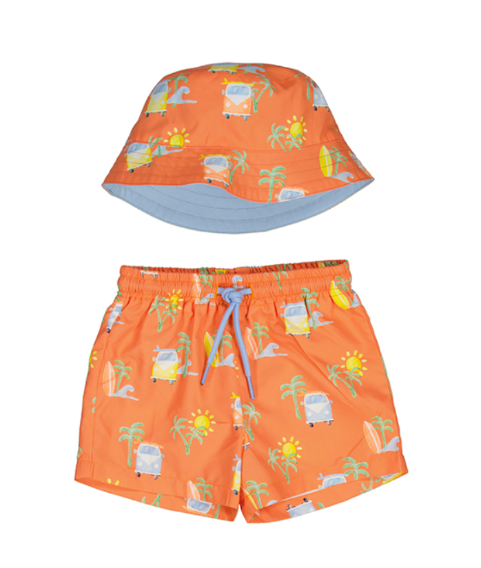 This set features orange swim shorts paired with a coordinating bucket hat. Both items showcase a vibrant orange background adorned with charming prints of VW buses and palm trees, perfect for a stylish and playful beach look.