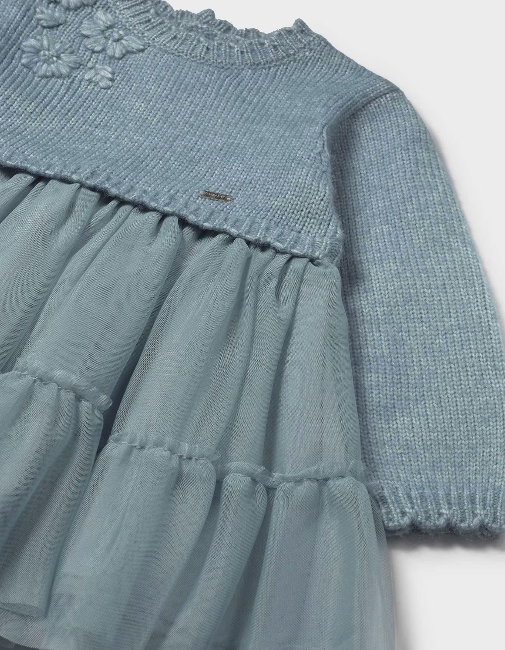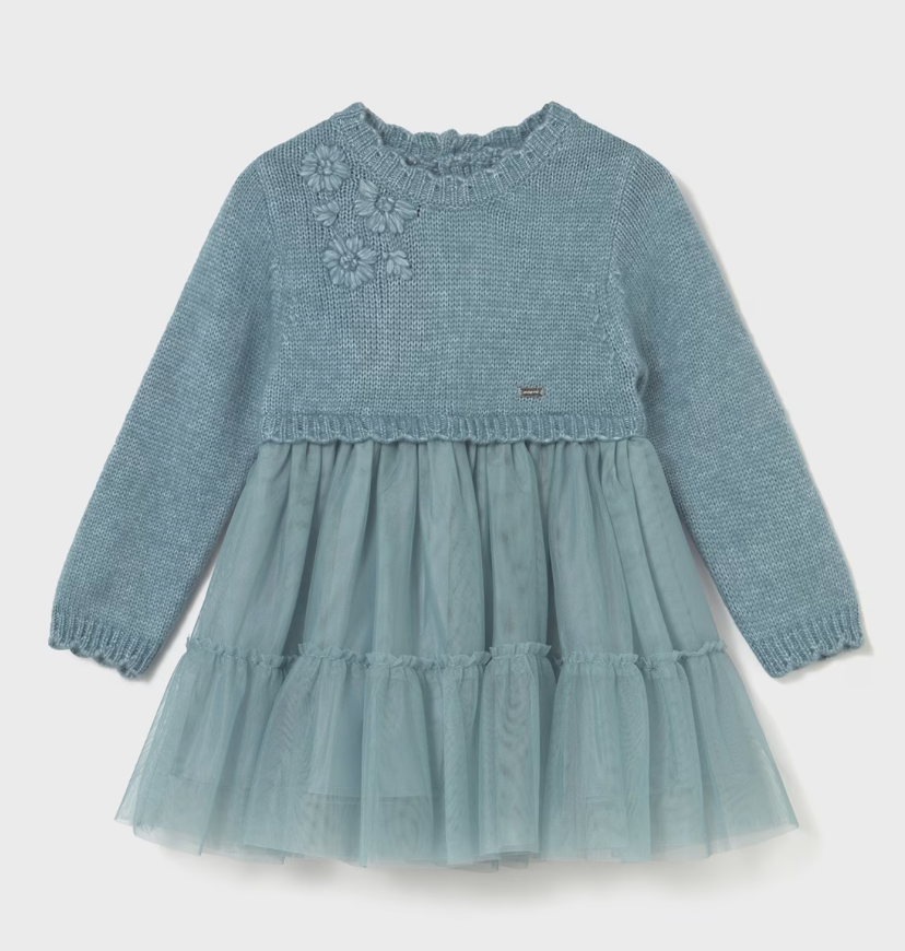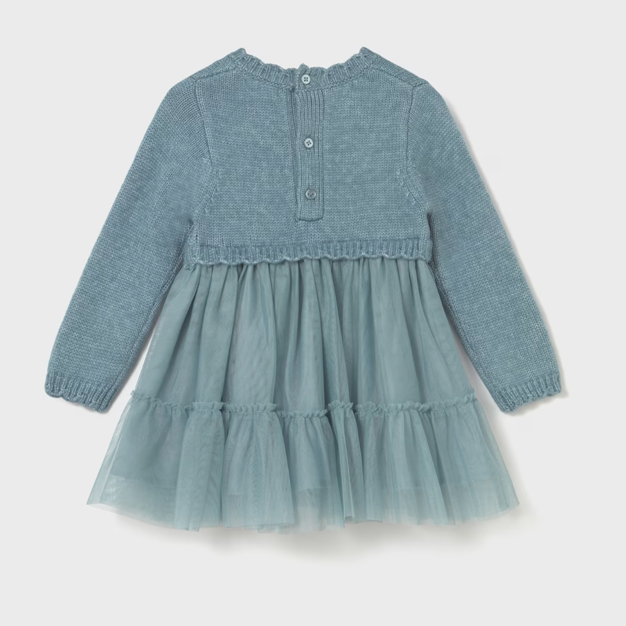 This long-sleeved teal Knit & Tulle Dress combines elegance with thoughtful design, featuring a waved collar that adds a delicate touch.