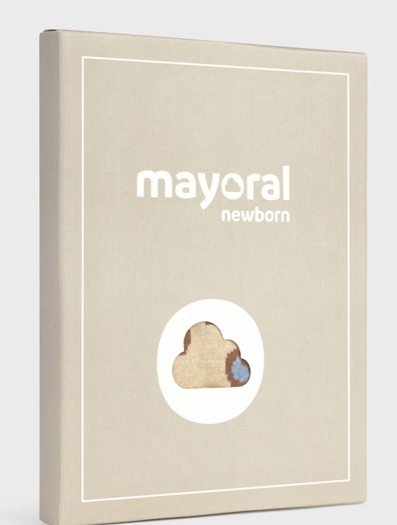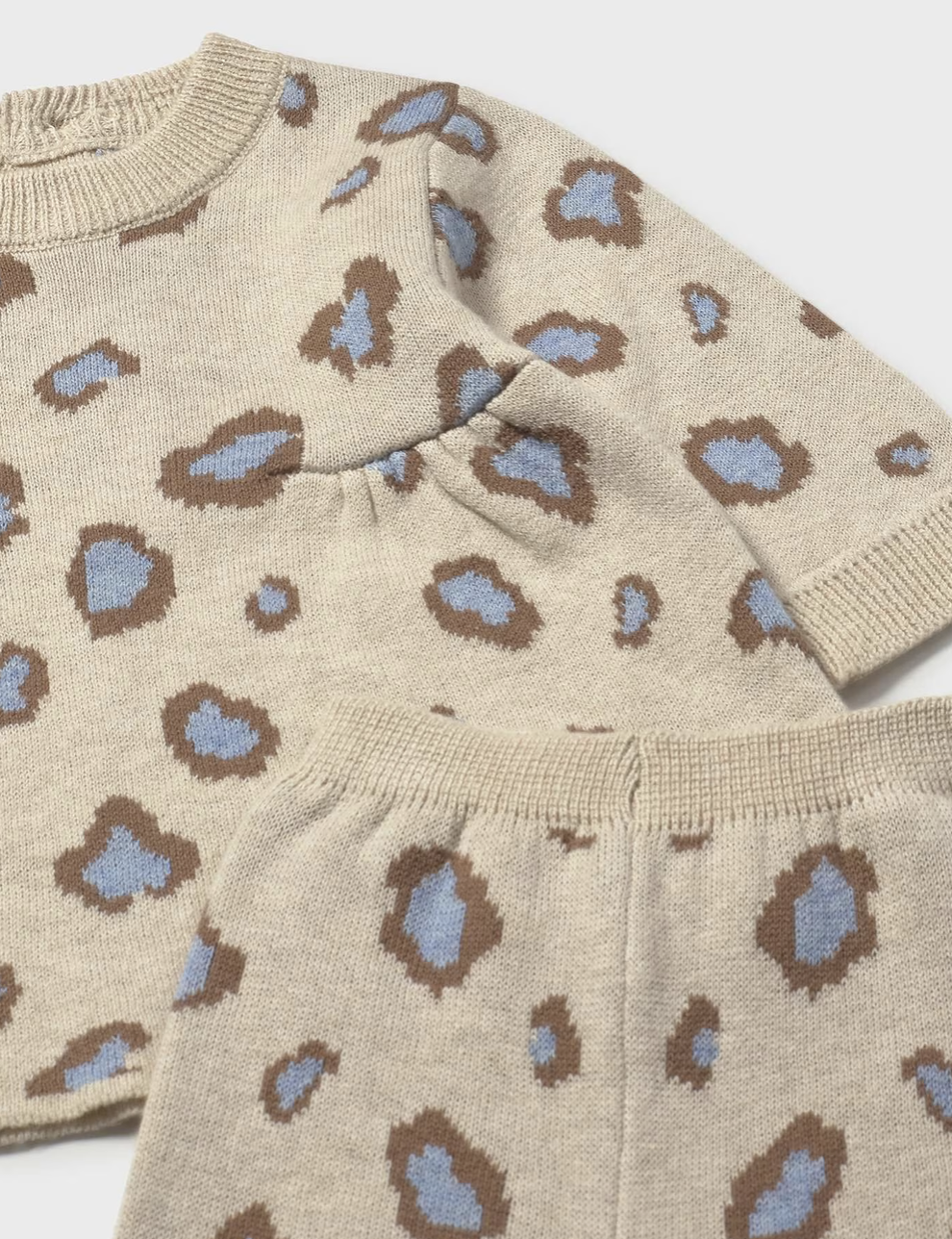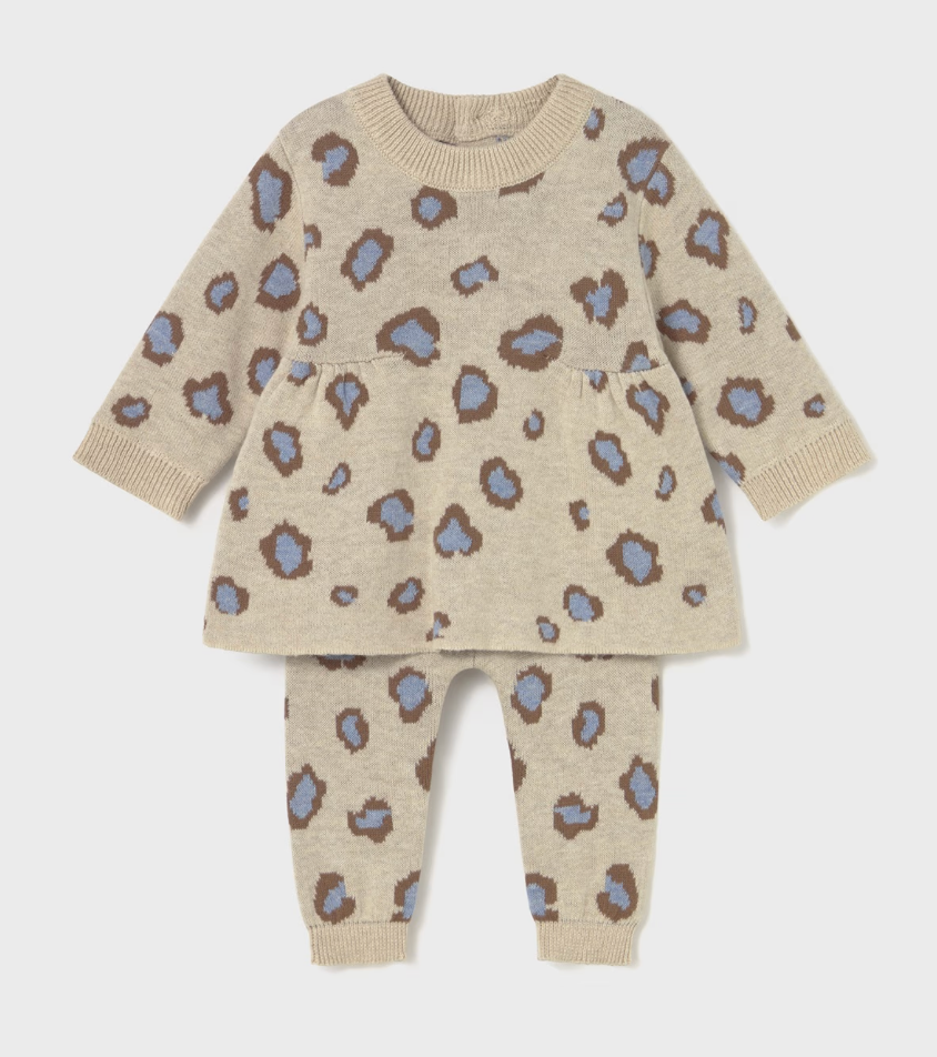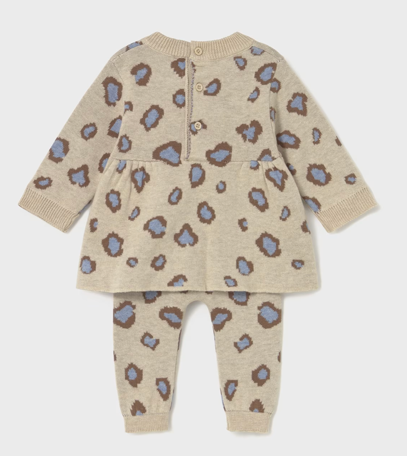 This Taupe & Blue Sweater & Pant Set is thoughtfully designed for newborn baby girls, combining comfort with effortless style. The long-sleeved sweater features a round neckline and button fastenings down the back, allowing for easy dressing and undressing without disturbing the baby. Crafted from soft, knitted fabric, it offers a gentle touch against delicate skin, enhanced by subtle gathered details and intricate jacquard stitch patterns that add a refined texture. The accompanying pants include an elastic waistband to ensure a secure yet flexible fit, accommodating a baby’s natural movements. This set harmonizes practical design with elegant craftsmanship, making it an ideal choice for everyday wear or special occasions