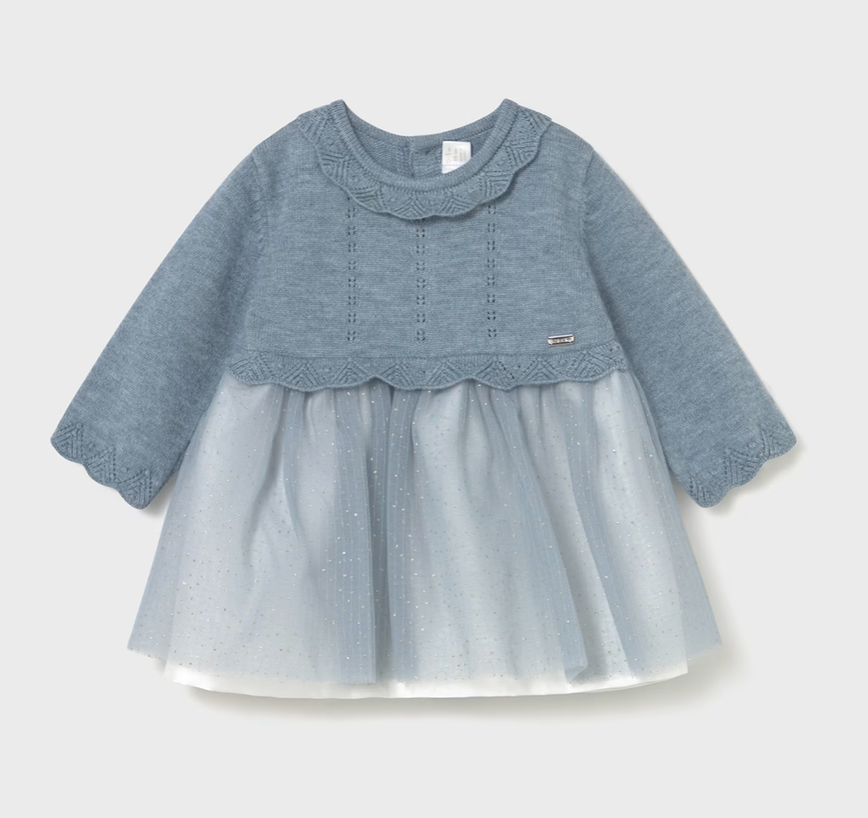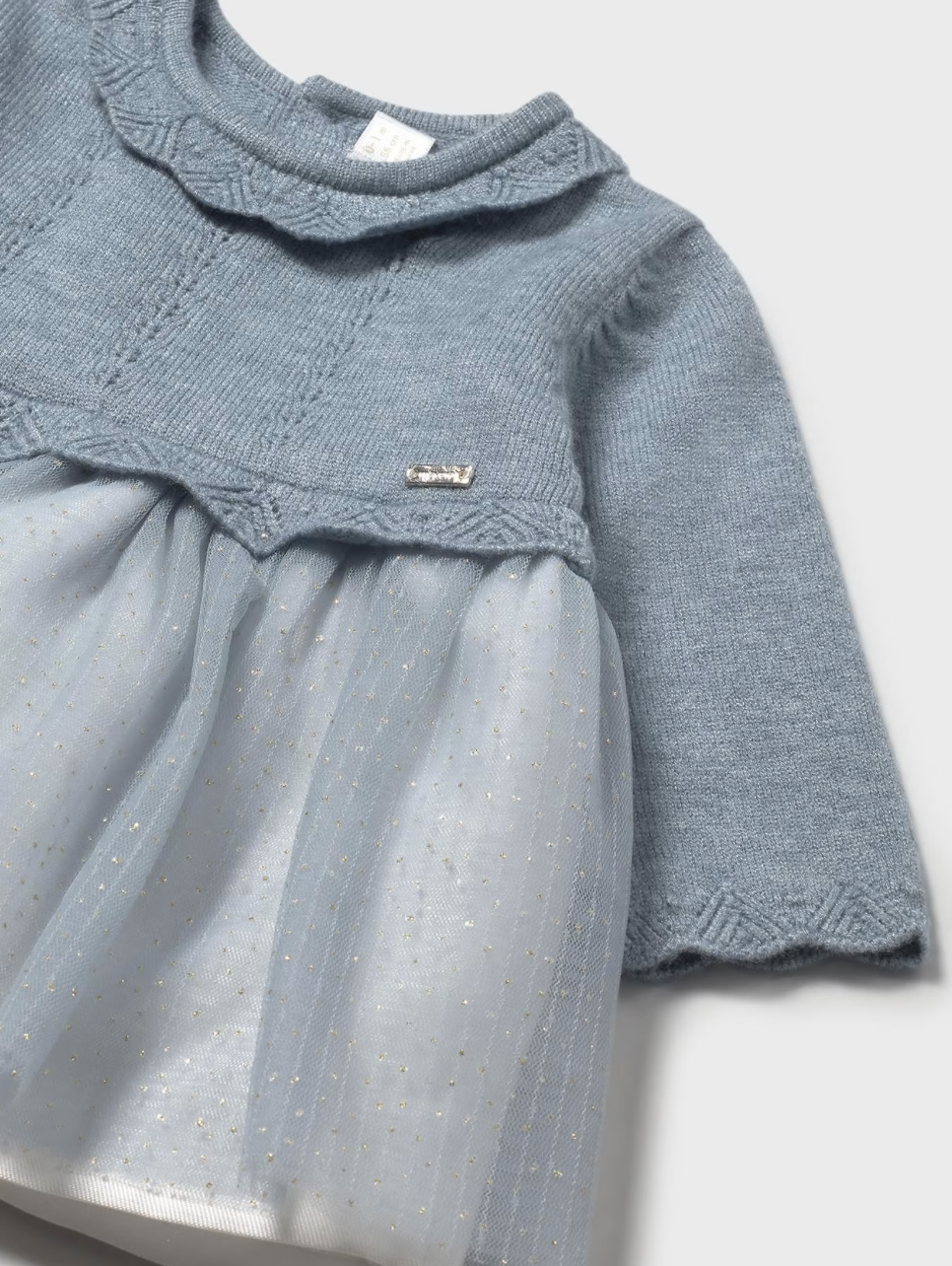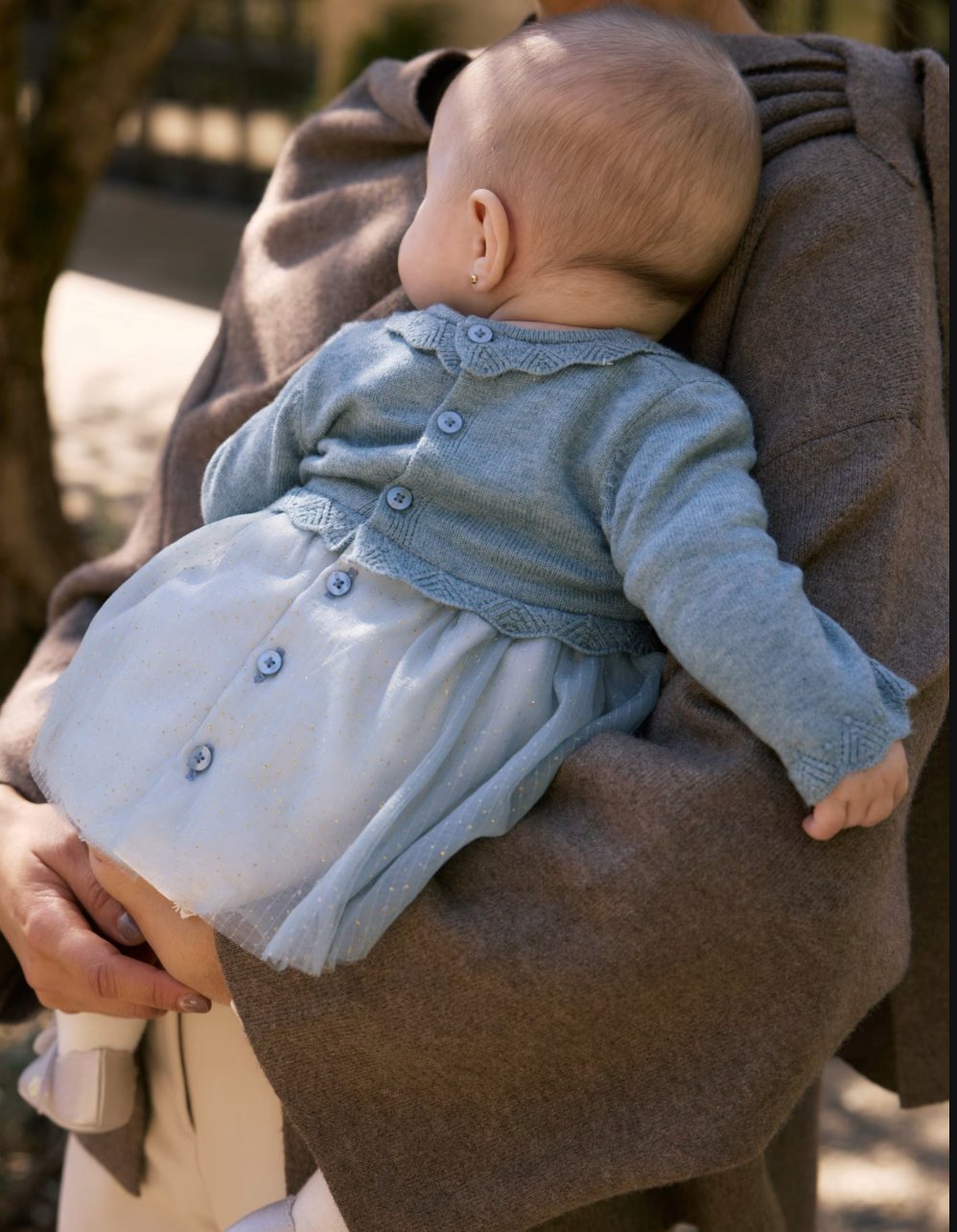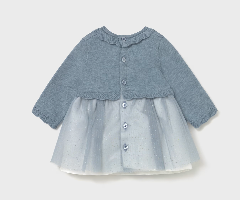 This long-sleeved dress for newborn baby girls combines delicate design with practical features for comfort and ease. It features a round neckline adorned with gentle ruffles that add a charming touch. Button fastenings run down the back, enabling effortless dressing and removal, ideal for handling a newborn's needs. Crafted from lightweight, sheer tulle fabric, the dress offers breathability while maintaining an elegant appearance. The knitted base fabric ensures a soft, pleasant feel against sensitive skin, reducing irritation. Its gathered design provides gentle fullness and movement, making this dress both beautiful and comfortable for your baby’s early days.
