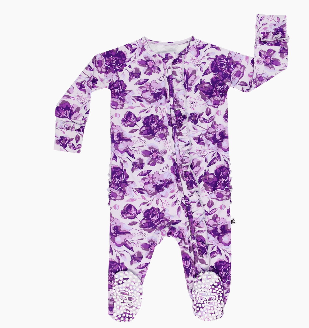 If you're a ruffle lover, this 2-way zipper footie will hit the spot! Made with our yummy, hypoallergenic, silky-smooth fabric and topped off with no-slip grips on the foot pads to ensure your little one stays stable as they grow. * 2-way zip for easy changing * Ruffle details on bottom, shoulders, and sleeves * Non-slip grip foot pads * Tagless size label for total comfort * Safe for sensitive skin