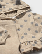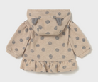 This tan-colored knitted hoodie features a classic button-up design combined with unique decorative elements for a stylish yet cozy look. The soft polka dot pattern in gray adds subtle visual interest, while delicate ruffles at the hem and shoulders provide a feminine touch and enhance the silhouette. The hood is complemented with gray ears on top, giving this piece a playful and charming character. Ideal for layering, it offers warmth and comfort without sacrificing style, making it a versatile addition to any wardrobe. Crafted with attention to detail, this hoodie balances practicality with whimsical design elements.