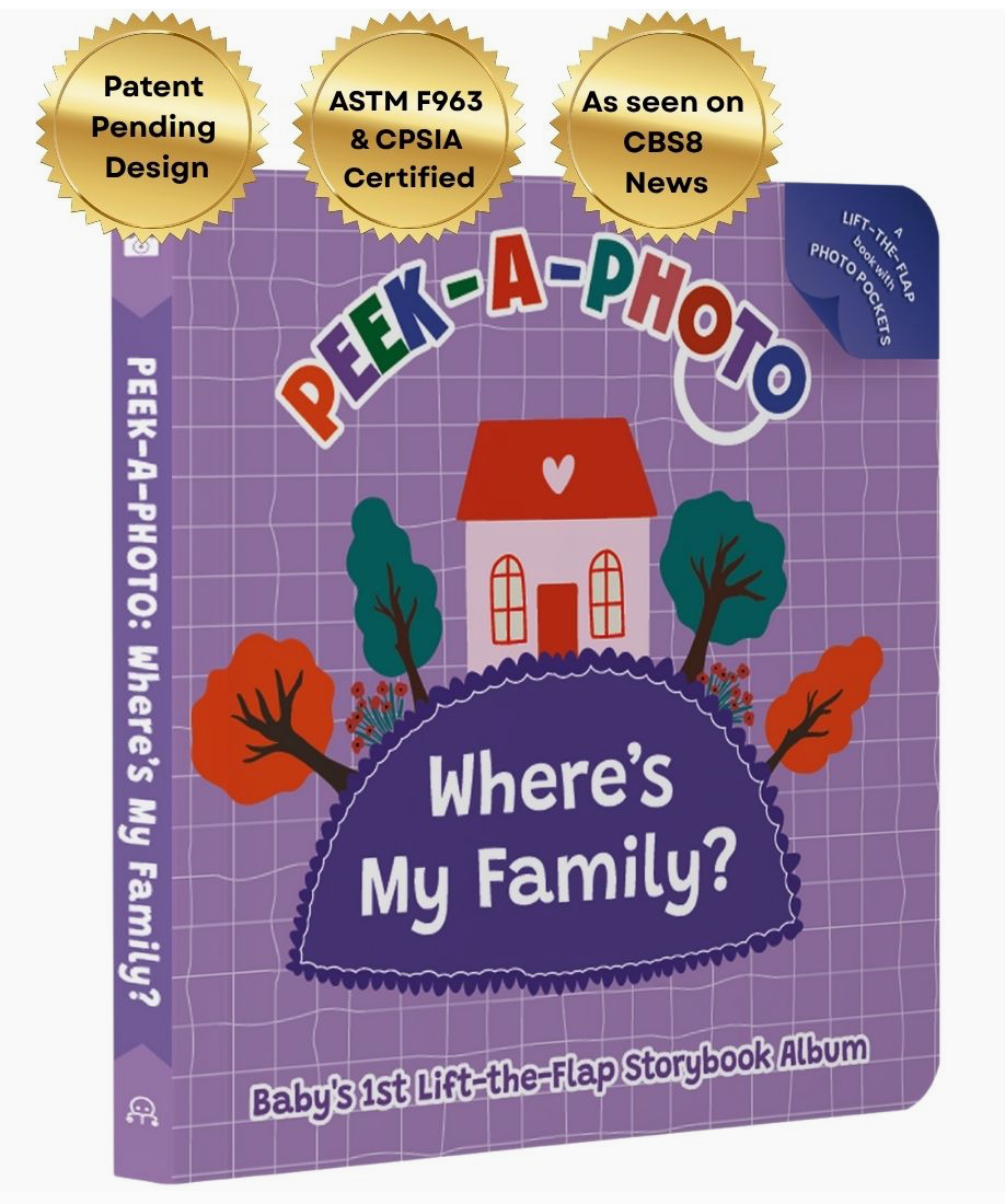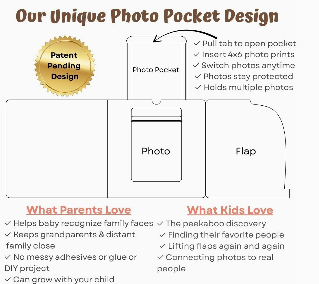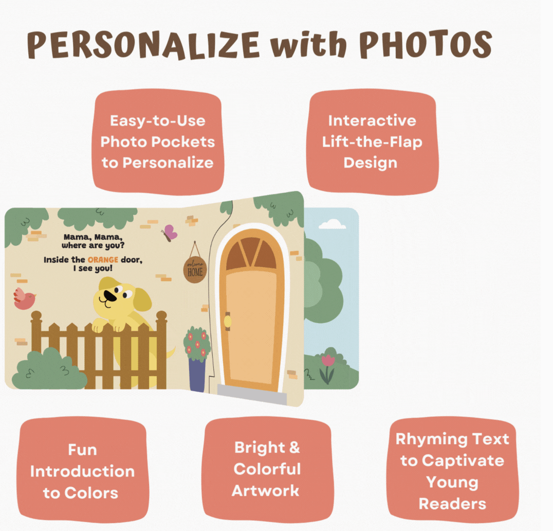 Our patent-pending lift-the-flap storybook albums combines the durability of traditional board books with the personalization of family photos, creating meaningful bonding moments during storytime.