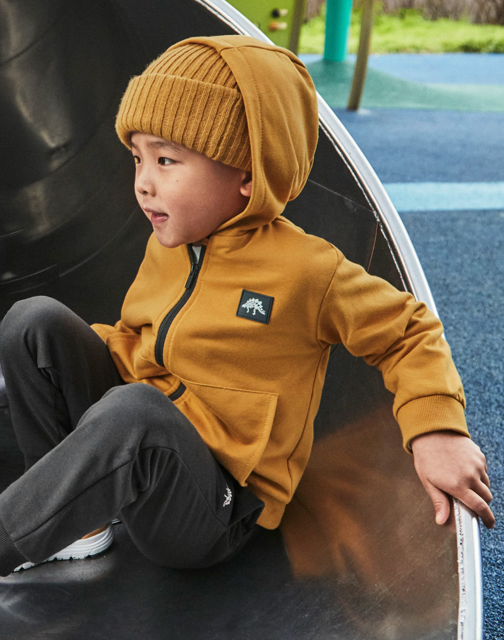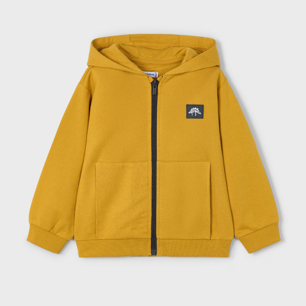 This mustard-colored long-sleeved hoodie is designed specifically for boys, combining comfort and practicality. It features a hooded collar that provides extra warmth and protection, perfect for cooler days.
