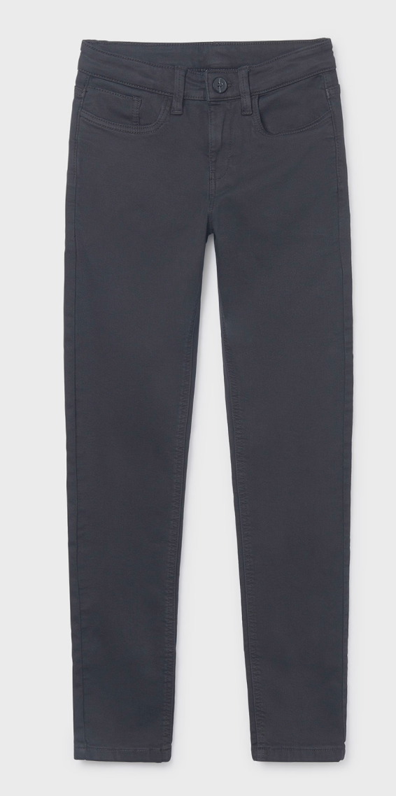 Slim fit pants for boys. Single button fastening. Adjustable elastic waistband with buttons inside the waistband for a better fit. Functional front pockets. Functional back pockets
