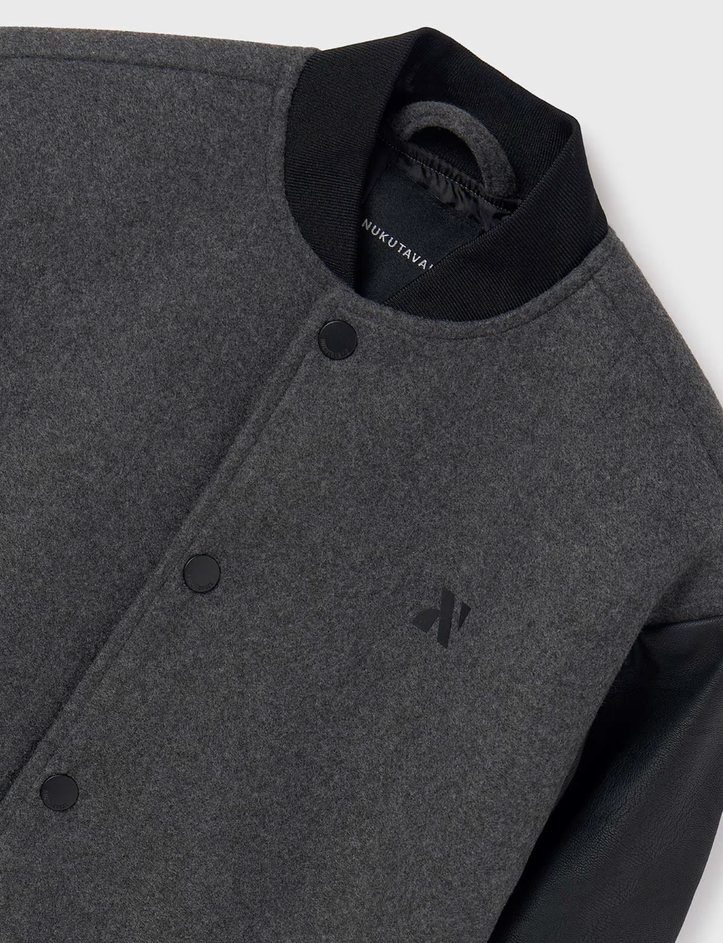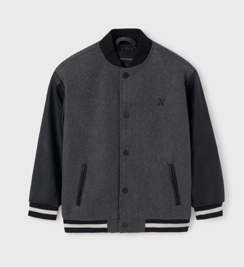 Dark grey body, and black faux leather sleeves with white stripe at the bottom.