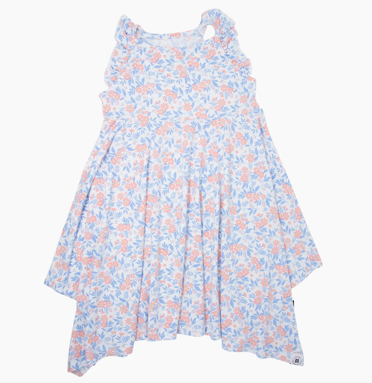 Knee length dress with a racer-back neckline Ruffle trim and ultra-twirl skirt Flexible for active lifestyles Safe for sensitive skin