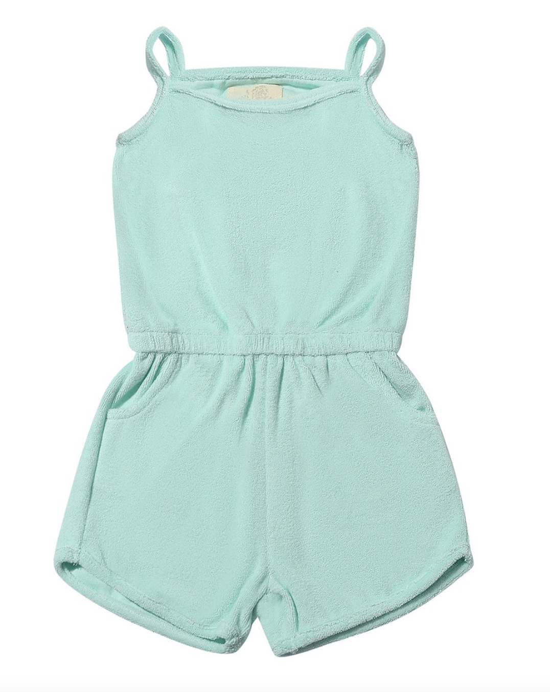 100% cotton, very comfortable one-piece romper. It even has pockets!