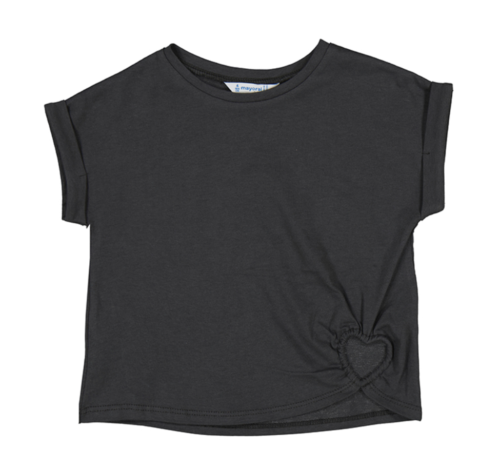 This premium charcoal t-shirt crafted from 100% cotton features a distinctive heart detail (wrapped in fabric) elegantly positioned on the left hip. The sophisticated design is complemented by tailored folded cap sleeves, creating a refined silhouette for versatile styling options.