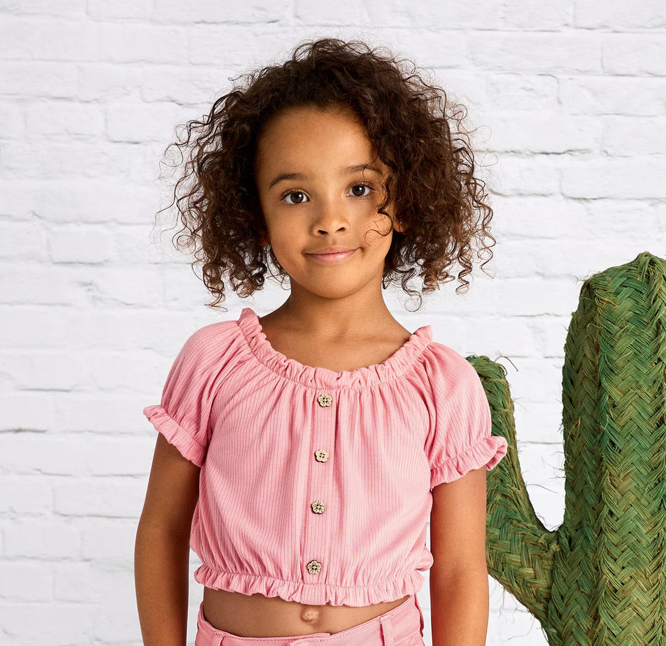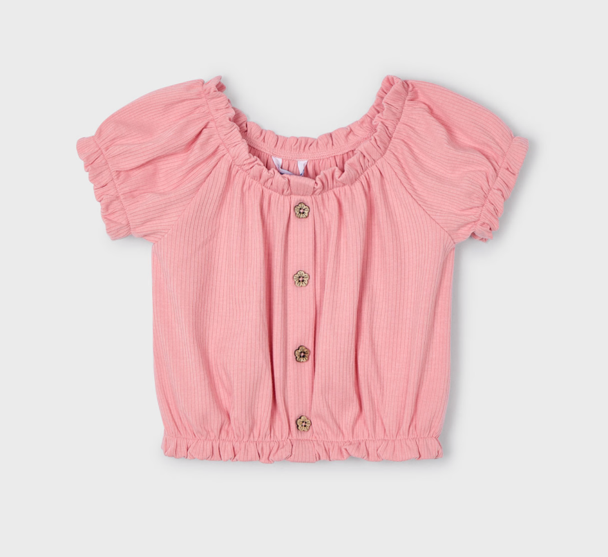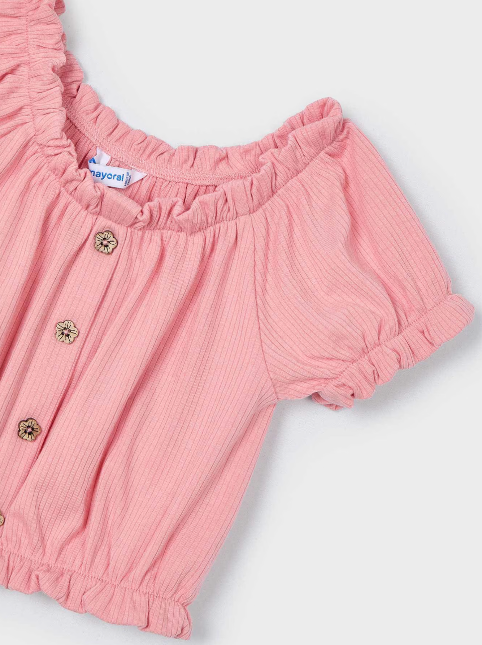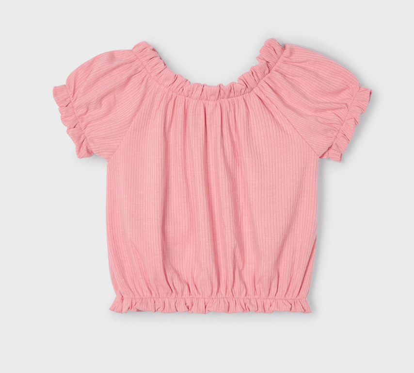 Adorable girls ribbed t-shirt featuring ruffle edges in a lovely salmon pink hue.