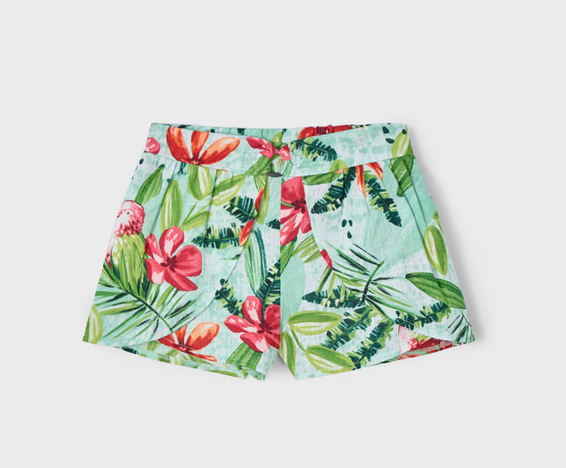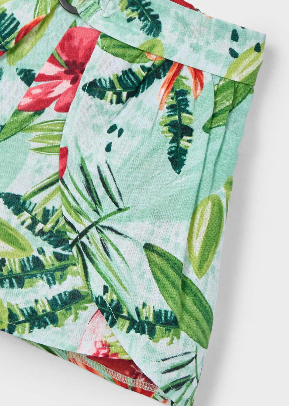 This skort is made of 100% cotton and features a tropical print and a charming sewn-in belt detail at the waist