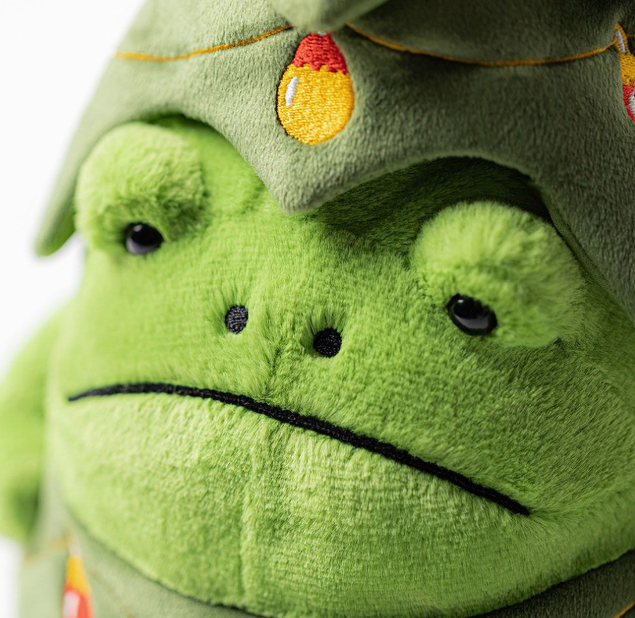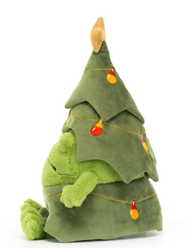 Bring the 'Bah, humbug', big-style, with Christmas Tree Ricky Rain Frog! Our squat, mossy frog wears a Christmas tree costume, with a star-topped hat and matching scalloped dress, all embroidered with baubles. Bring Ricky to the party and everyone smiles!