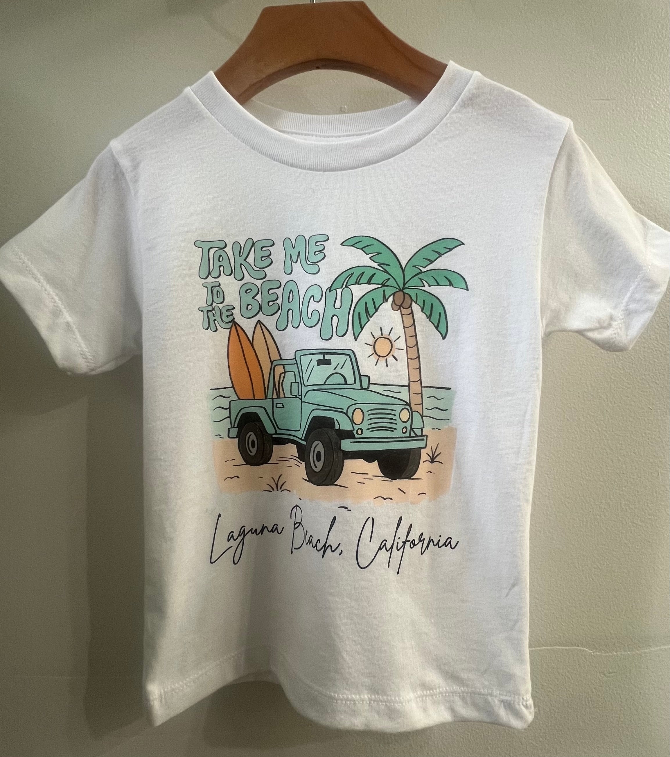 The shirt features "Laguna Beach" prominently displayed alongside iconic beach imagery—a classic jeep, swaying palm tree, and two surfboards—all complemented by the inviting phrase "Take me to the Beach."