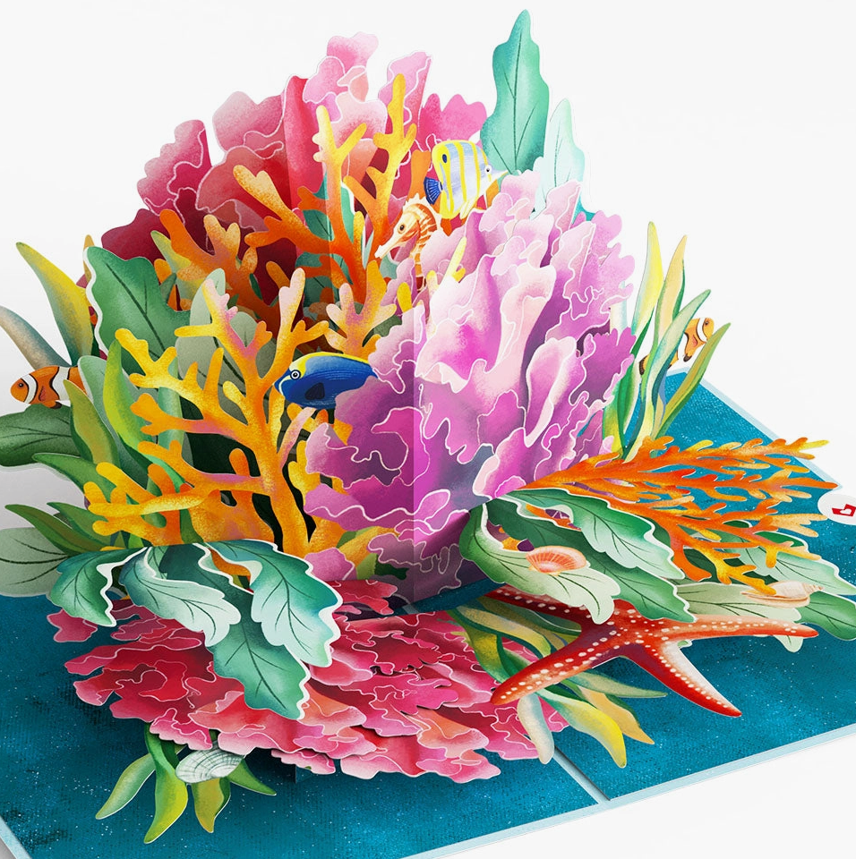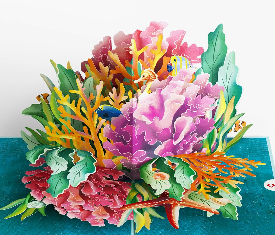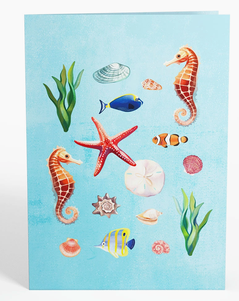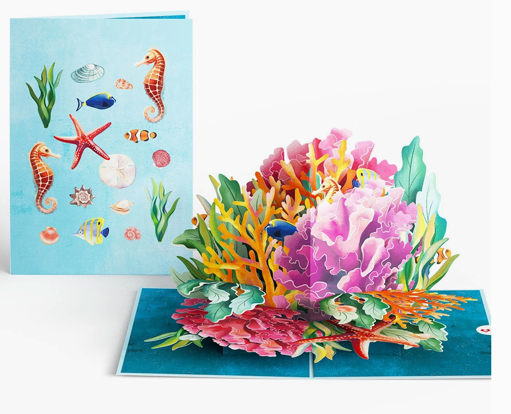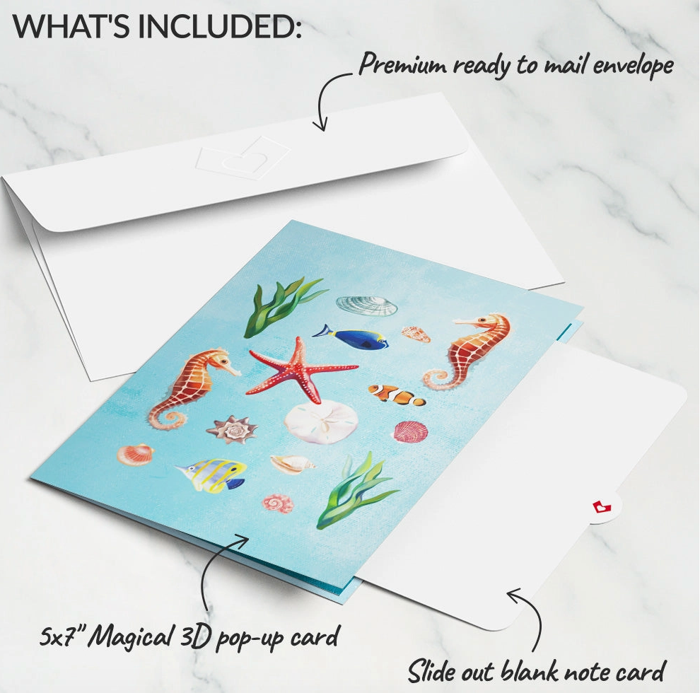 Description: Bring them oceanside with this pop-up card featuring a vibrant underwater coral reef bursting with colorful sea life, including fish, seahorses, and starfish. The intricate 3D design captures the beauty of the ocean, making it a perfect keepsake for marine life lovers. This greeting card is an ideal choice for any occasion, especially for someone who finds joy in the beauty of the ocean! * 3D pop-up card measures 5”x7” * Includes one slide out note that can be personalized and sent directly to the recipient * Premium envelope (extra postage may be required)
