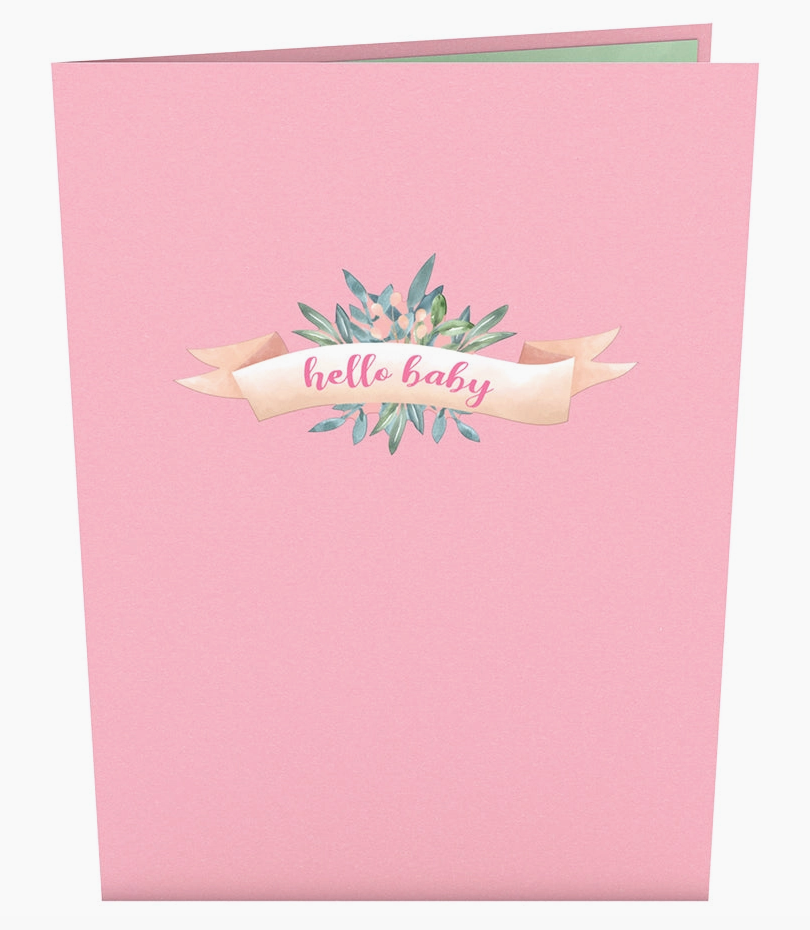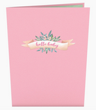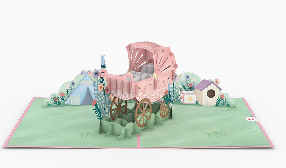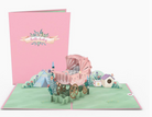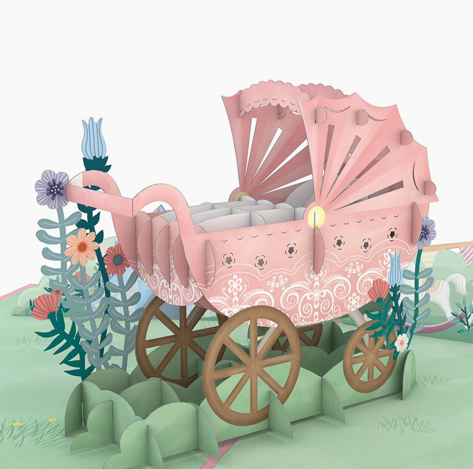 The front cover of this precious card is light pink, features a delicate floral bundle behind a graceful banner that has "Hello baby" written in fancy script. Once opened, a dainty pink antique baby carriage pop up, along with some blossoming spring flowers. This classic stroller appears on a grassy background, which is decorated with baby-themed items, such as a birdhouse, a child's camping tent, toy blocks, a seesaw rocking horse, and of course, lots of beautiful blooming plants and flowers. Occasions for the Pink Baby Carriage pop-up card: This is the ideal card to send as a gender reveal, new baby or pregnancy announcement. Let your spouse, friends and family members know that you are expecting a bundle of joy, or celebrate a special baby shower!