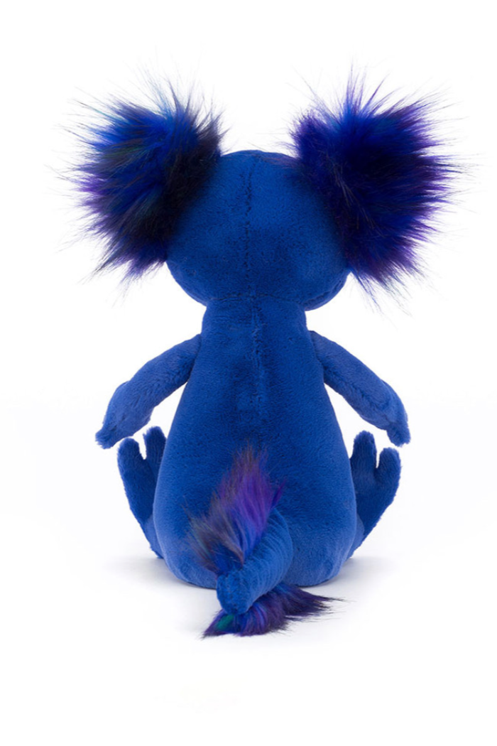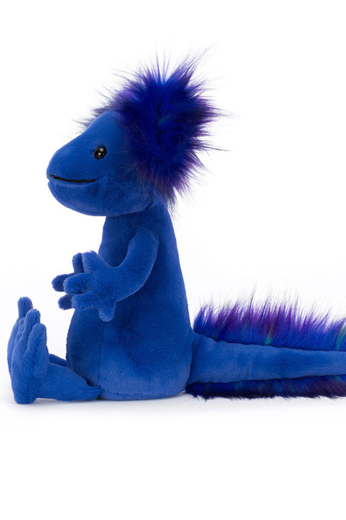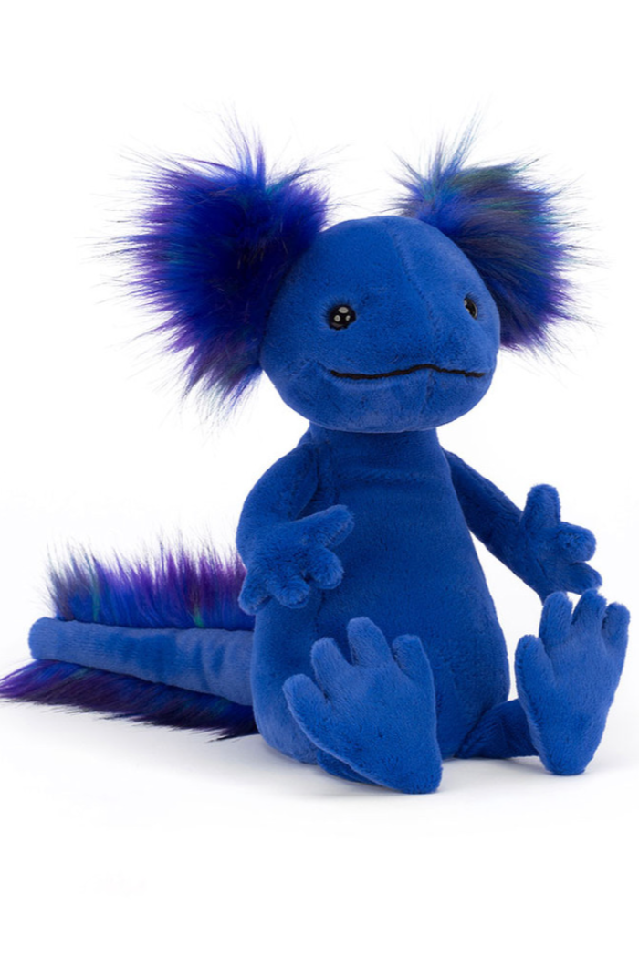 Andie Axolotl is a bold and bubbly scamp who loves to paddle in the river with those big bobbly feet! This funky blue friend comes from Mexico and rocks a rainbow of tufts in electric purple, green and indigo! From fuzzy head to squidgy tail, Andie's a fiesta of fun!