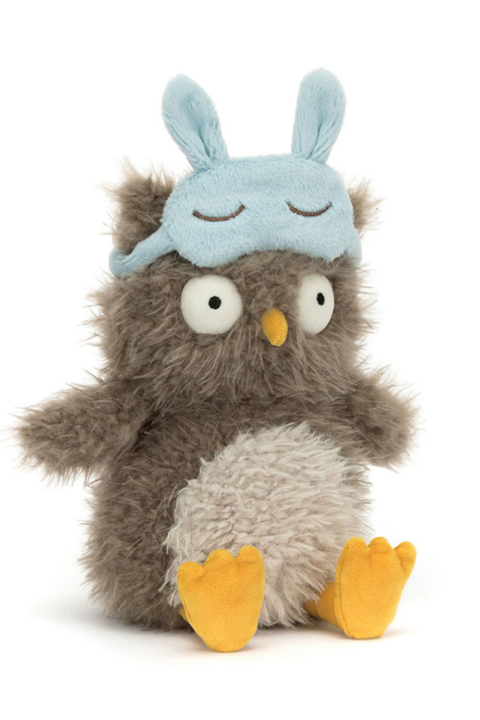 Audrey Hootsoftly loves to sleep in, which is why she's wearing her blue suedette mask! It's even got embroidered lashes! This mocha owl has bed-head fur and wide-awake bobble eyes! With sunny feet, tiny wings and a oatmeal patch on her tummy, Audrey's an absolute hoot.