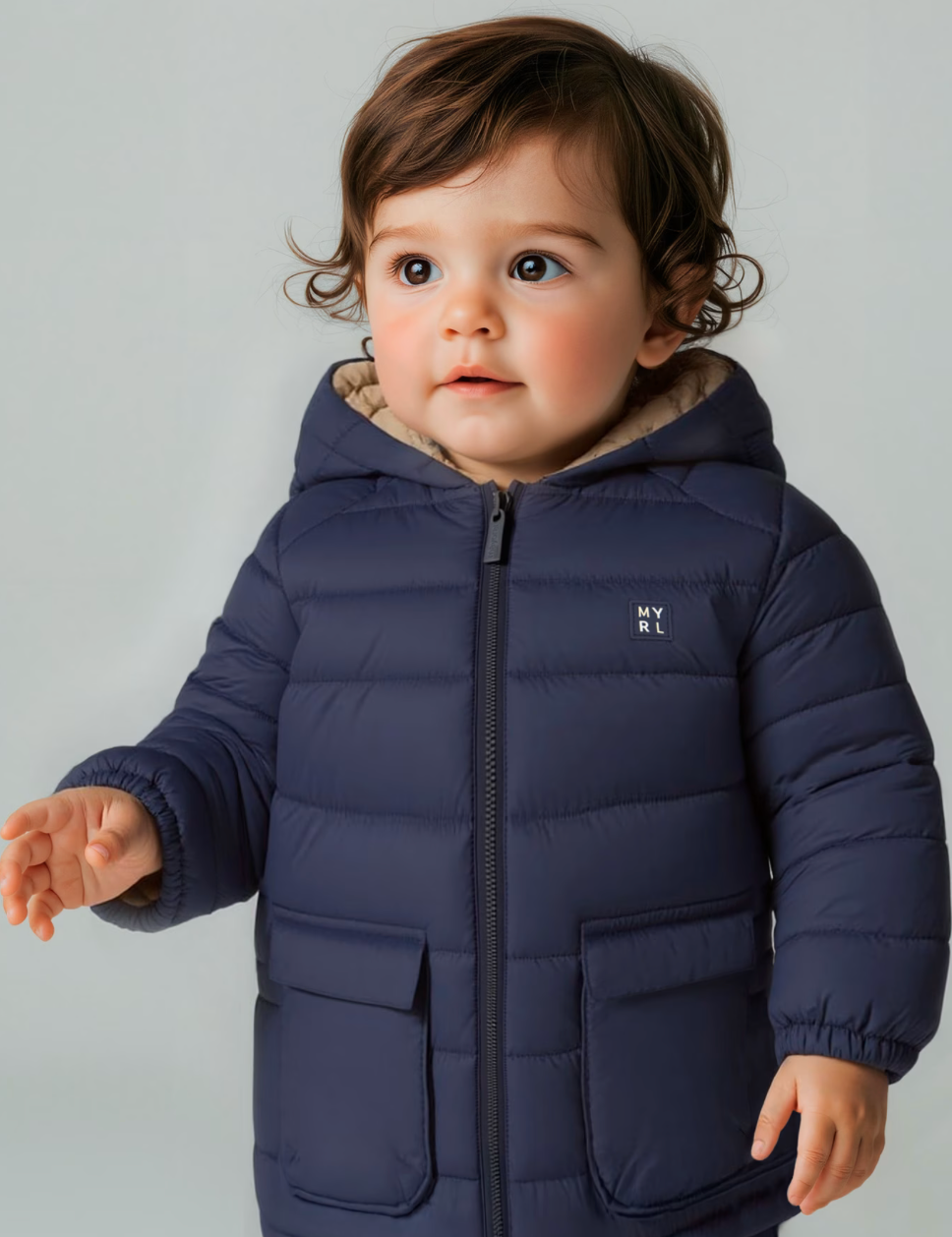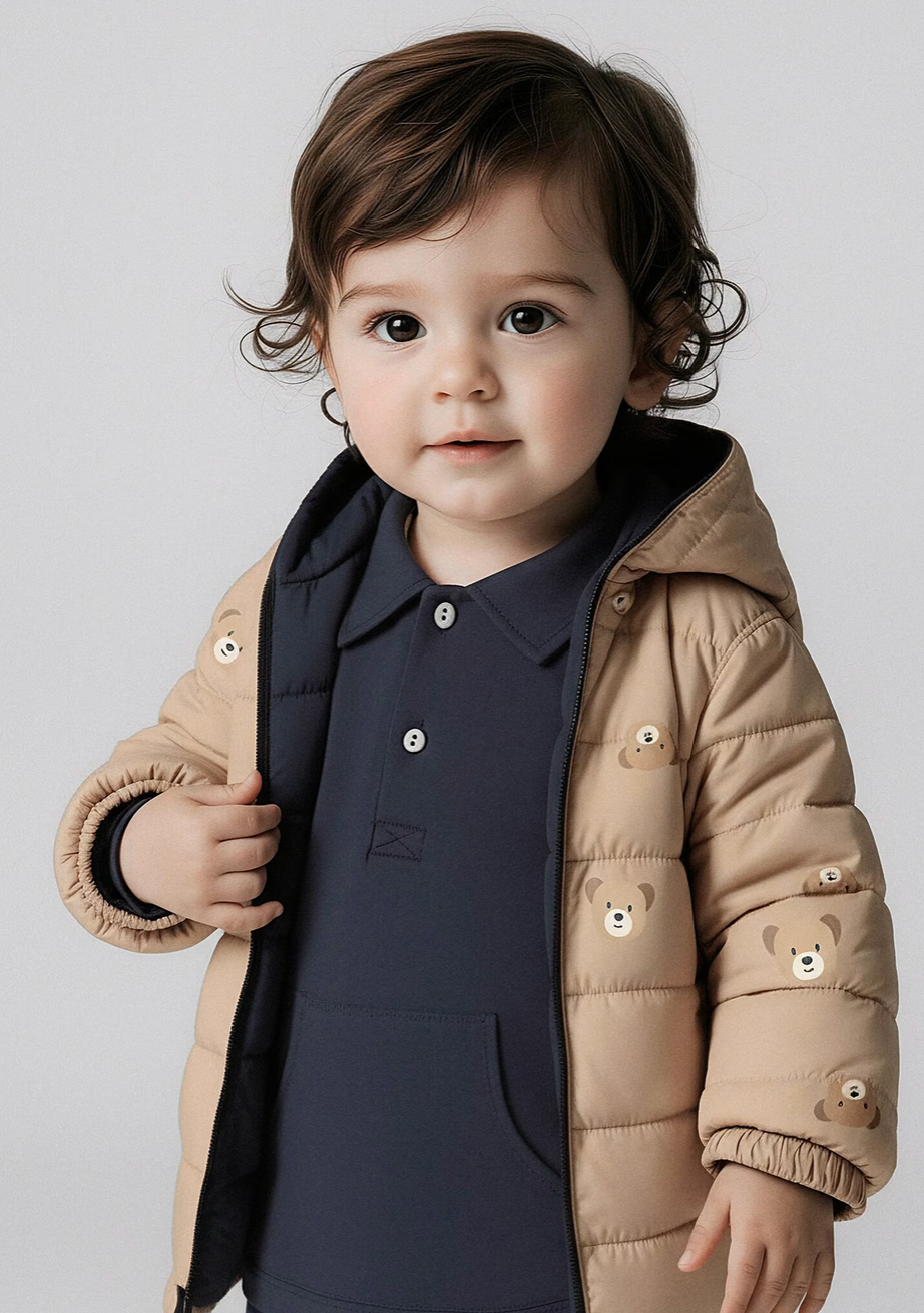The Baby Bear Soft Coat is a long-sleeved puffer jacket designed specifically for babies, combining warmth and comfort with practical features. It features a hooded collar for added protection against cold weather and a front central zip fastening that ensures easy dressing and secure closure. The exterior is made from durable textile with a charming quilted effect, enhancing both style and insulation. Inside, a soft polyester lining provides gentle warmth and comfort against delicate skin. Elasticated hems, cuffs, and collar create a snug fit that helps to retain heat and keep the cold out, making it ideal for chilly days. This coat offers a thoughtful balance of functionality and coziness for your little one.