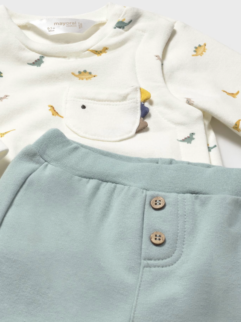 This newborn baby boy set combines comfort and style with thoughtful design details. The long-sleeved sweatshirt features a textural dinosaur appliqués, perfect for adding charm to your baby’s wardrobe. Designed with a round neckline, it ensures easy dressing thanks to side fastenings with press studs. For sizes 6-9 months, the side slit is replaced by press studs on the shoulder to accommodate growing infants comfortably.