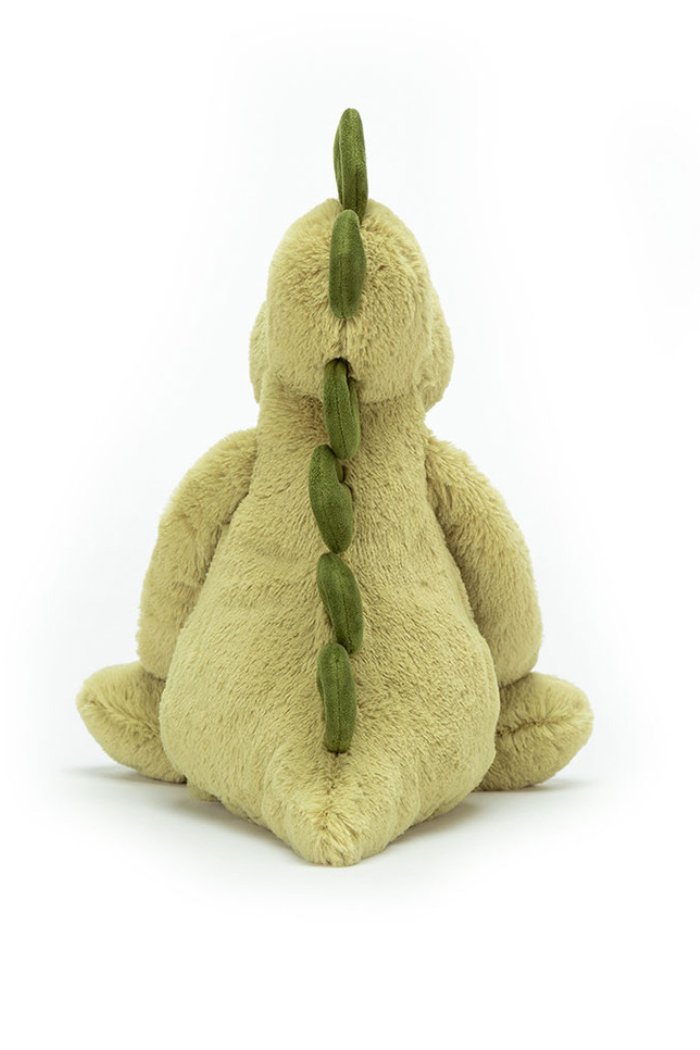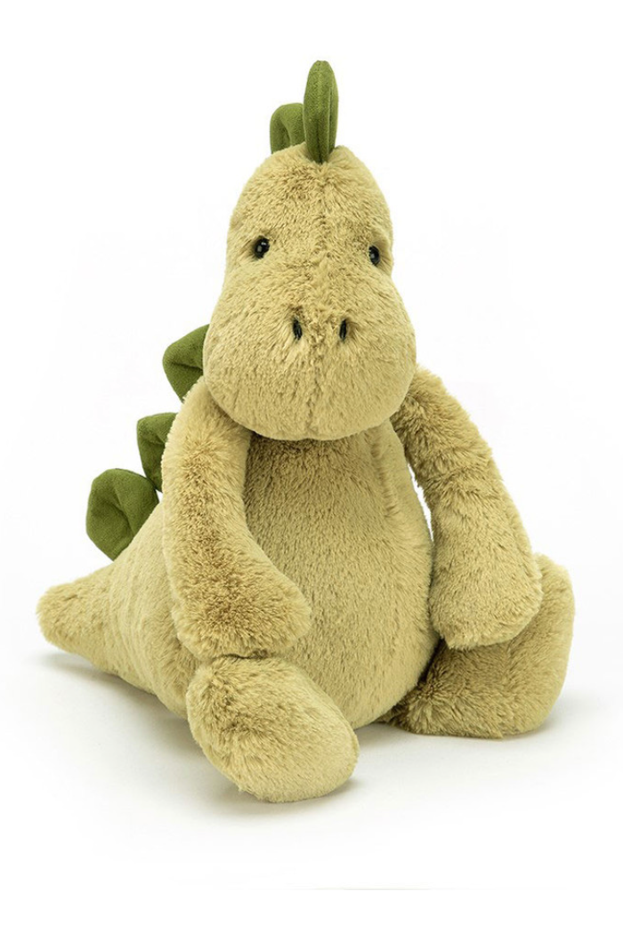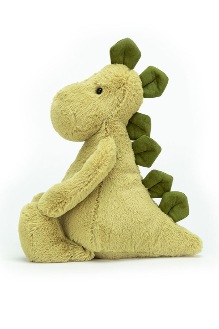 Bashful Dino is making history! Soft, not scaly, this mossy matey has chunky stomper-feet, a snuggly snout and fine squishy spines from head to tail! This dynamic dino is always rambling round, giving hugs to every t-Rex and triceratops!