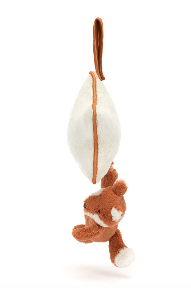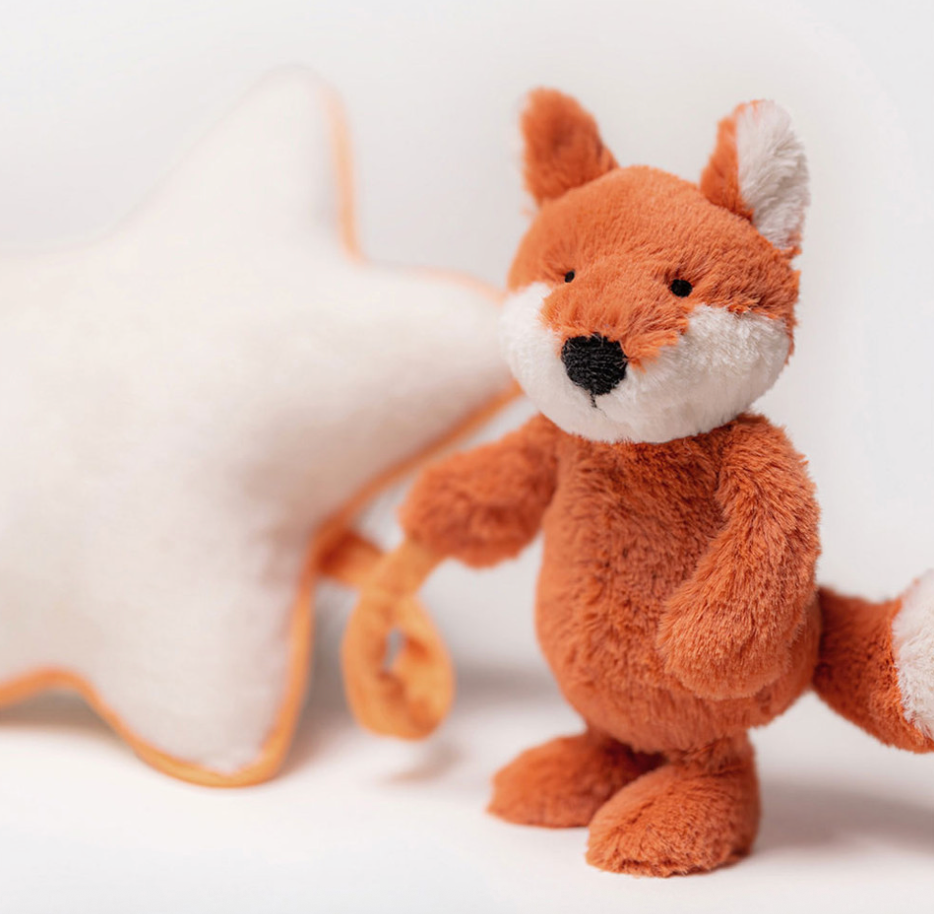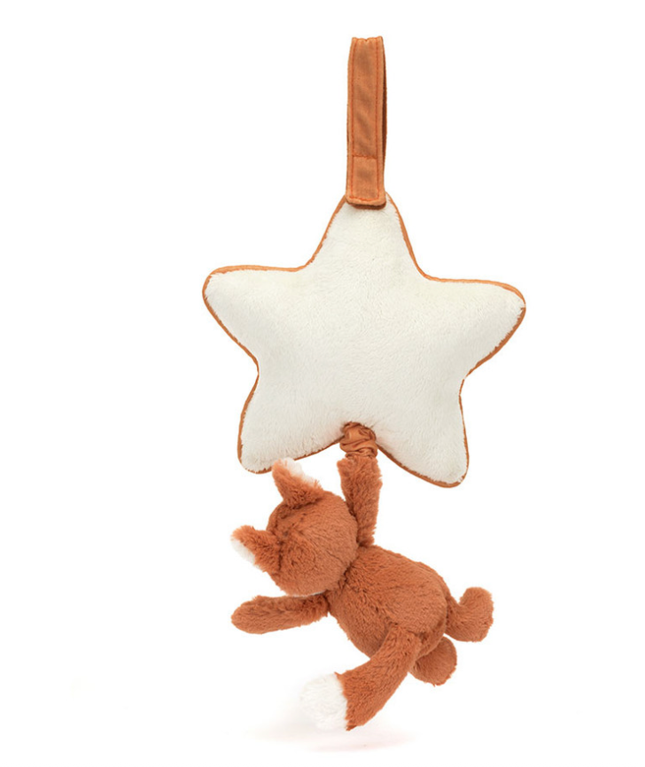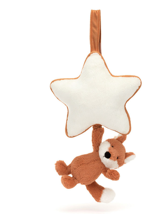 The Bashful Fox Cub Musical Pull is a soothing gift to help babies drift off. Our most loved fox cub has gorgeous orange fur with a cream mouth made with recycled fibers and holds on tight to a concertina pull. Gently pull the cub and an original Jellycat lullaby will play from the stylishly monochrome trimmed star.