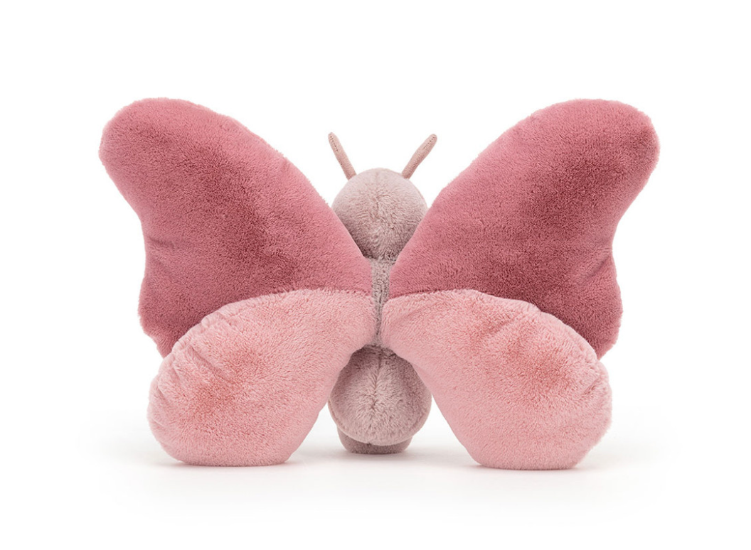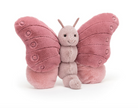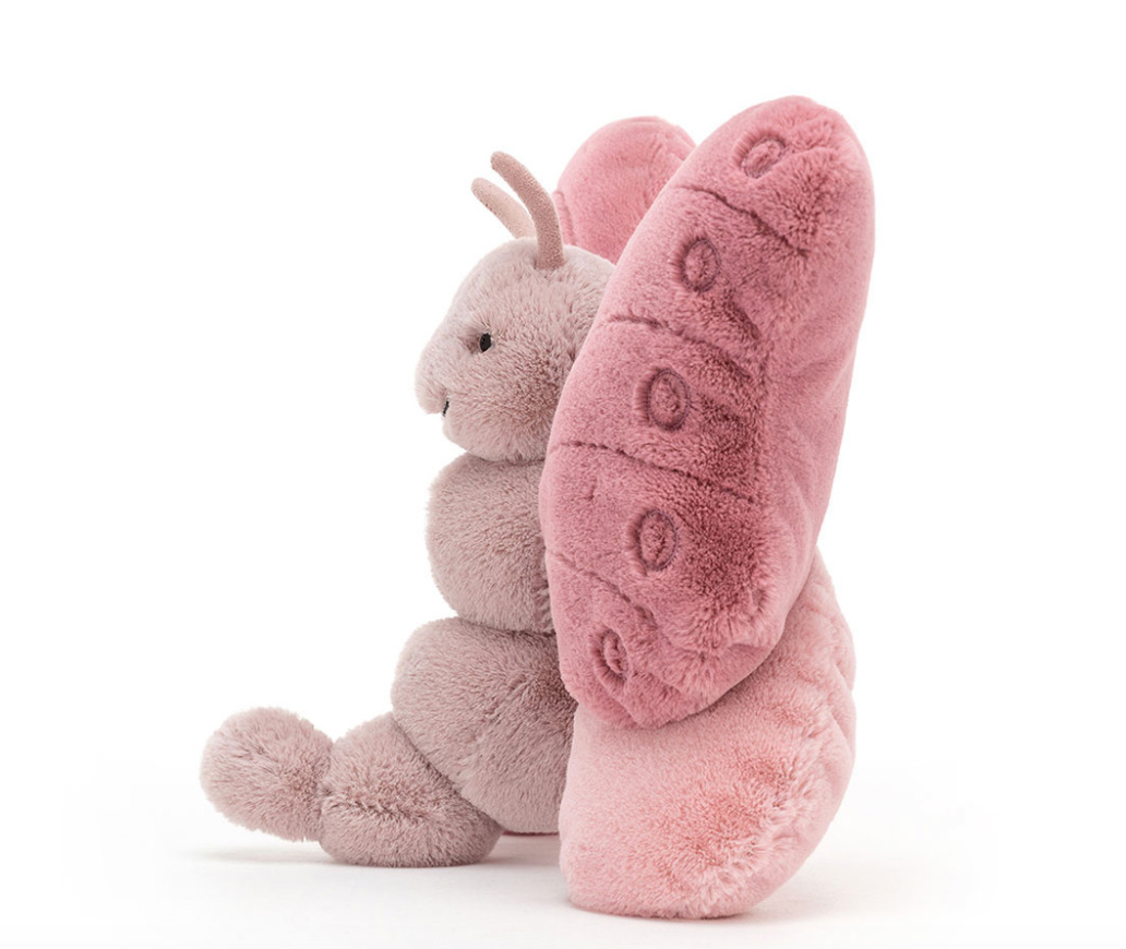 Fluttering in with a cheeky grin, it's beautiful Beatrice Butterfly! Rosy and cosy with a beany bottom, soft textured wings and suedey antennae, this bobbly buddy loves yummy nectar and playing all day in the garden!