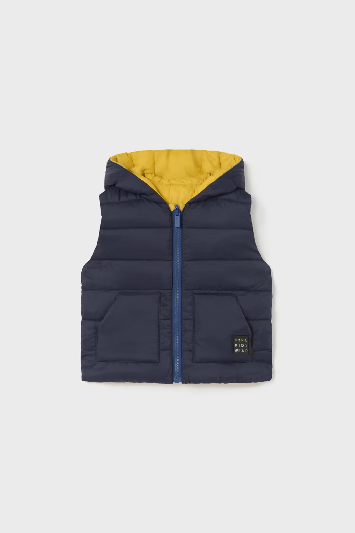 Dark Blue and Yellow reversible zip up vest. Maximum comfort while keeping your loved one warm on those winter days. Pockets and stitched patch on blue side.
