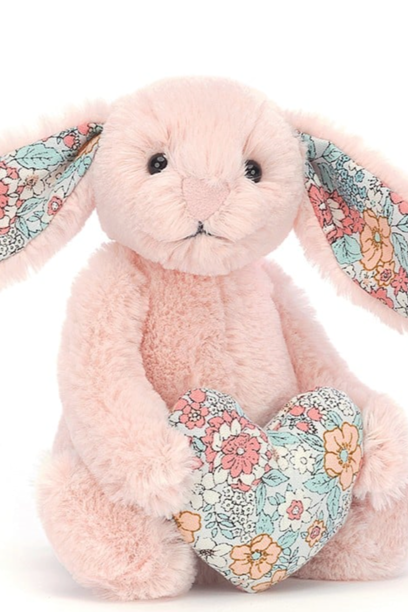 A gentle joy full of vintage snuggles, Blossom Heart Blush Bunny is peachy perfect. This dreamy soft bun has long flower print ears and a gorgeous heart to match. With a fluffy bobtail and Peter pink nose, this little pal makes a gorgeous gift, bouncing with understand sweetness.