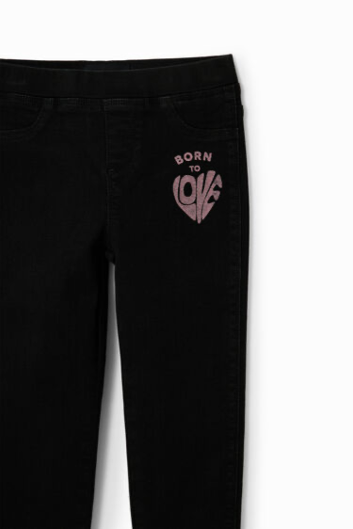 Black Jeans with an elastic waistband, Born to Love sparkle stamp above front left pocket