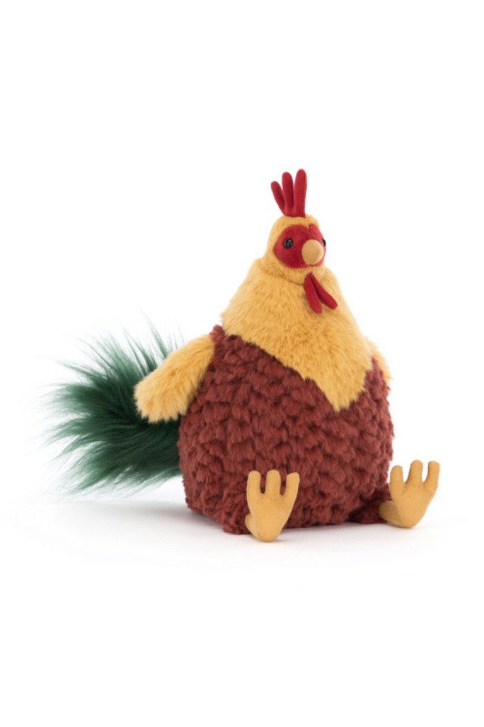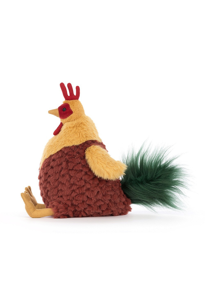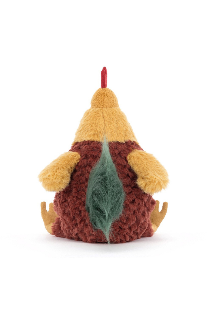 Proud and podgy, Cluny Cockerel is just like a big soft pineapple! This dizzy dandy has a tufty cocoa tum, custard bib and wings, and sunny suedey claws. Not to mention that fine scarlet wattle and comb, bold red eye mask and plumey green tail! A huggable hero!