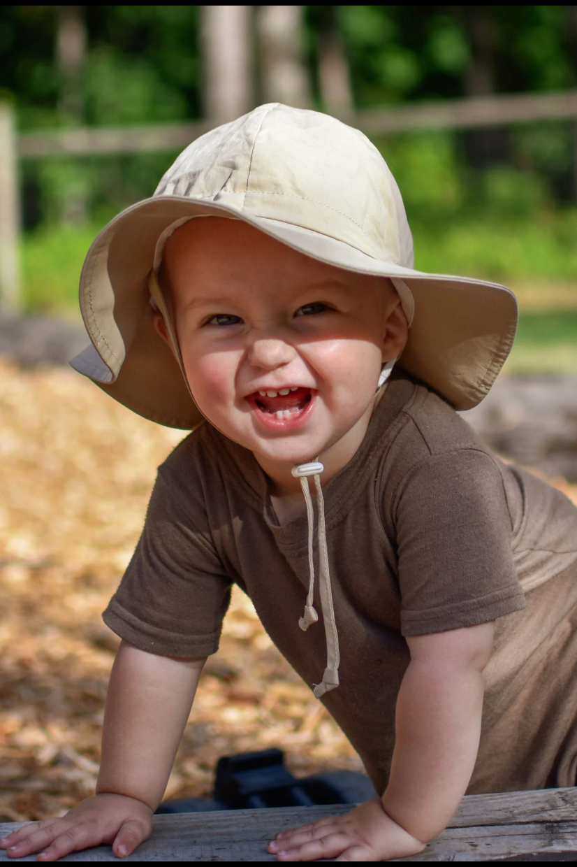 Jan & Jul's Gro-With-Me adjustable sun hats grow with your child so they can wear it for longer, thanks to a fully adjustable head drawstring and adjustable chinstrap. The wide brim of our Cotton Floppy Hats is designed to stay up in the front and “flop” to shade the neck in the back.