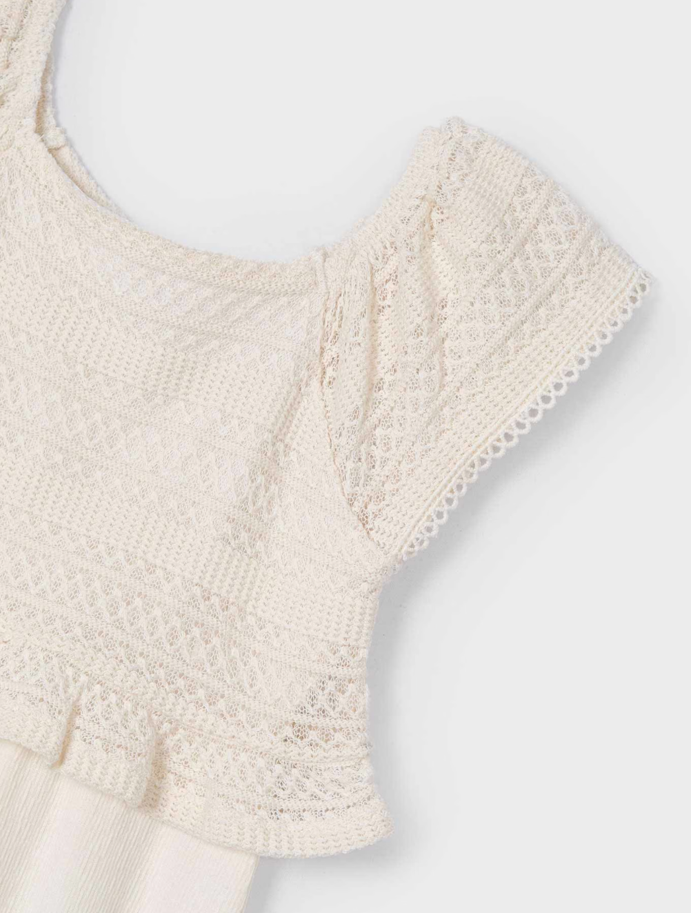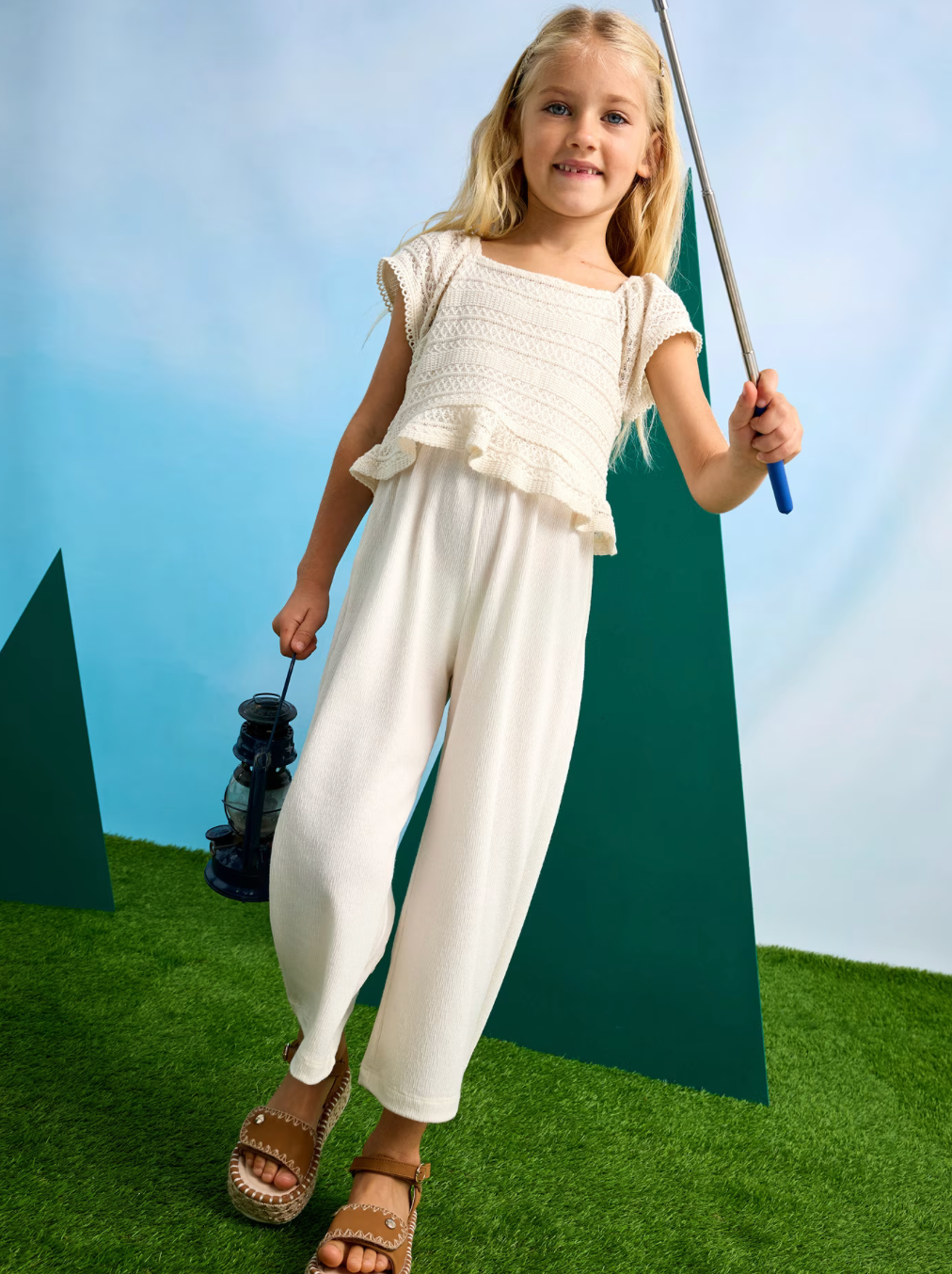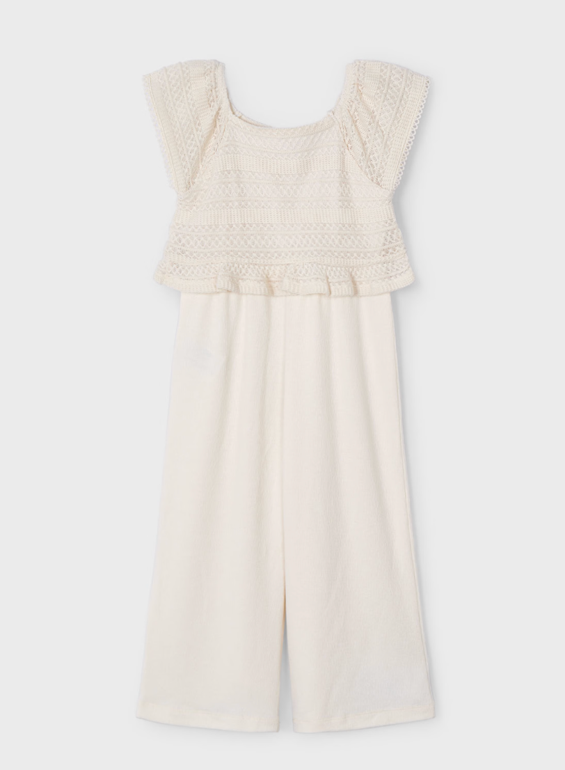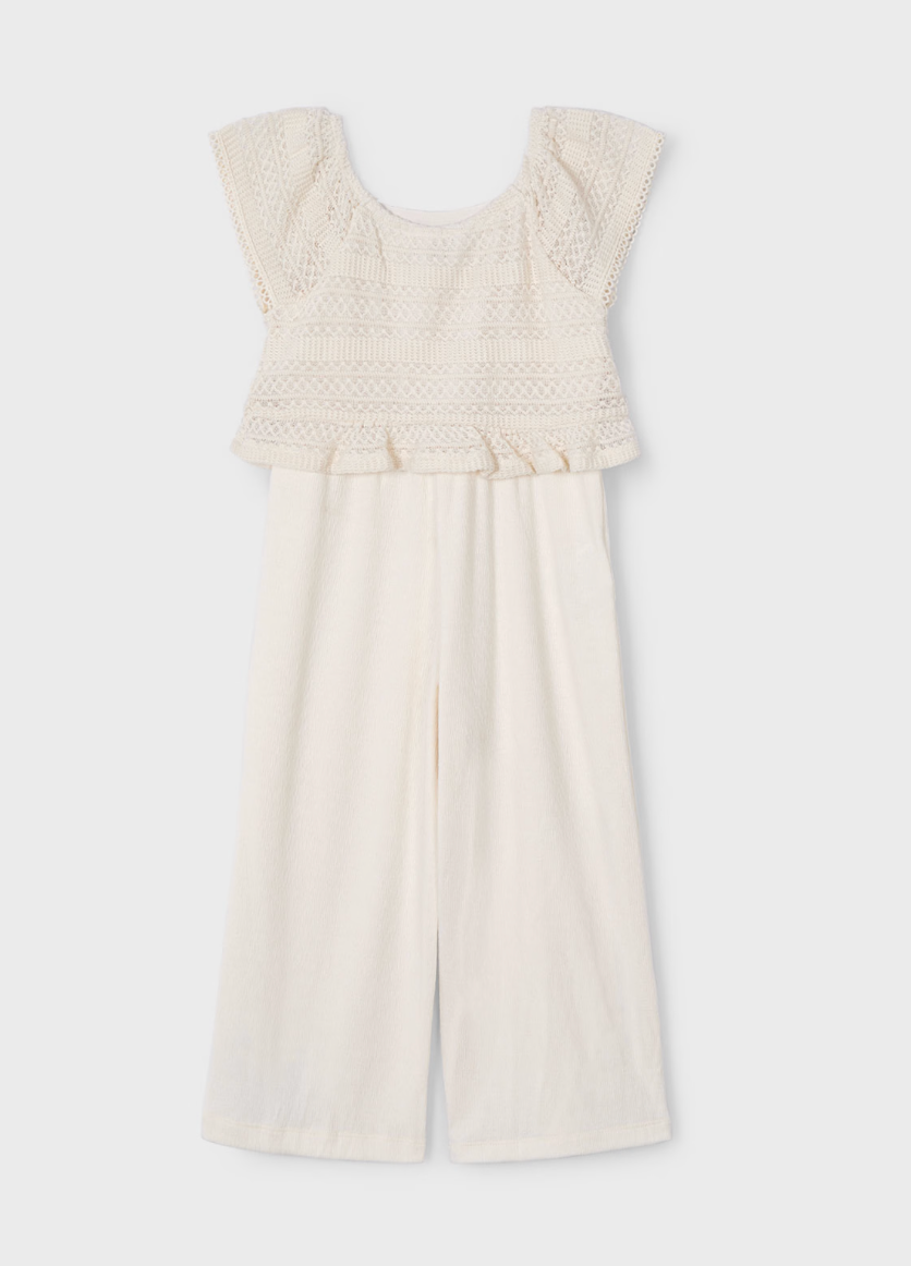 The jumpsuit is crafted from high-quality crochet material, making it comfortable and easy to wear. Its wide legs provide a relaxed fit that can be dressed up or down. The warm white color adds a touch of elegance to any wardrobe.