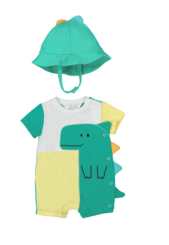 This one-piece dinosaur outfit is designed with colorblocking for a cute and playful look. The matching hat completes the ensemble. On the left side, a dinosaur appliqué adds a fun touch, and snaps on that same side make for effortless dressing and undressing.