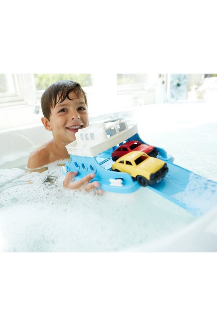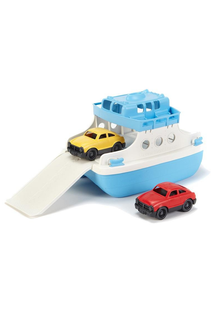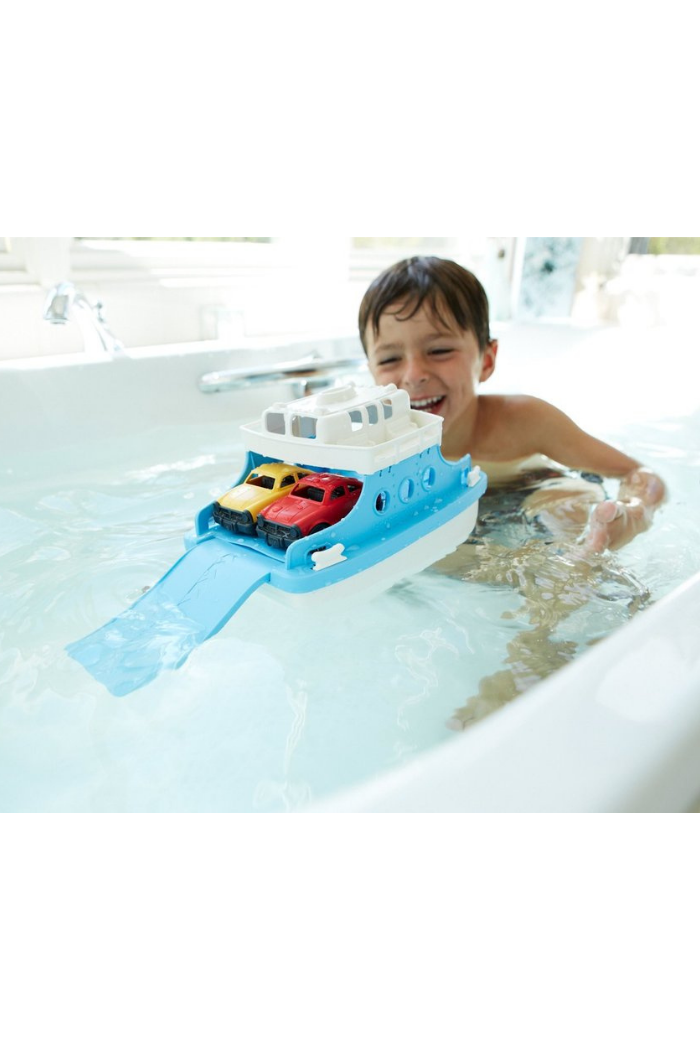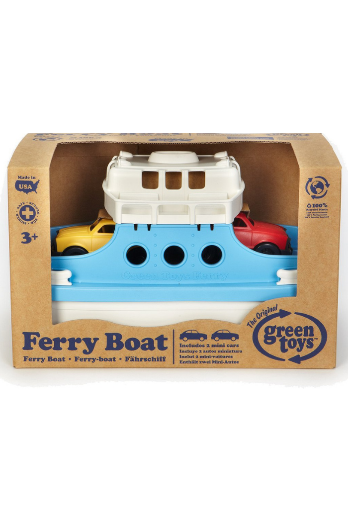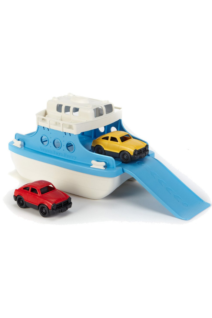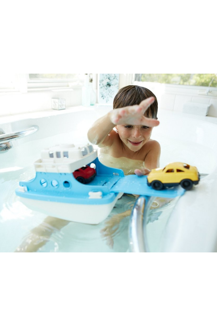 Set sail with the Green Toys Ferry Boat for a quick bathtub excursion or an extended trans-pool voyage. Whatever the adventure, this two-story vessel is ready to hit the open water with room for eco-friendly cargo galore, and even comes with two Green Toys Mini Fastbacks. Use the slide-out ramp to load up the spacious bottom level that accommodates up to four Green Toys cars. The open top deck features two small benches on each side, as well as eleven windows looking down into the main level. Made in the USA from 100% recycled plastic milk jugs that save energy and reduce greenhouse gas emissions, this craft is ideal for any body of water - durable, buoyant, and dishwasher safe. The hull also detaches for easy cleaning.