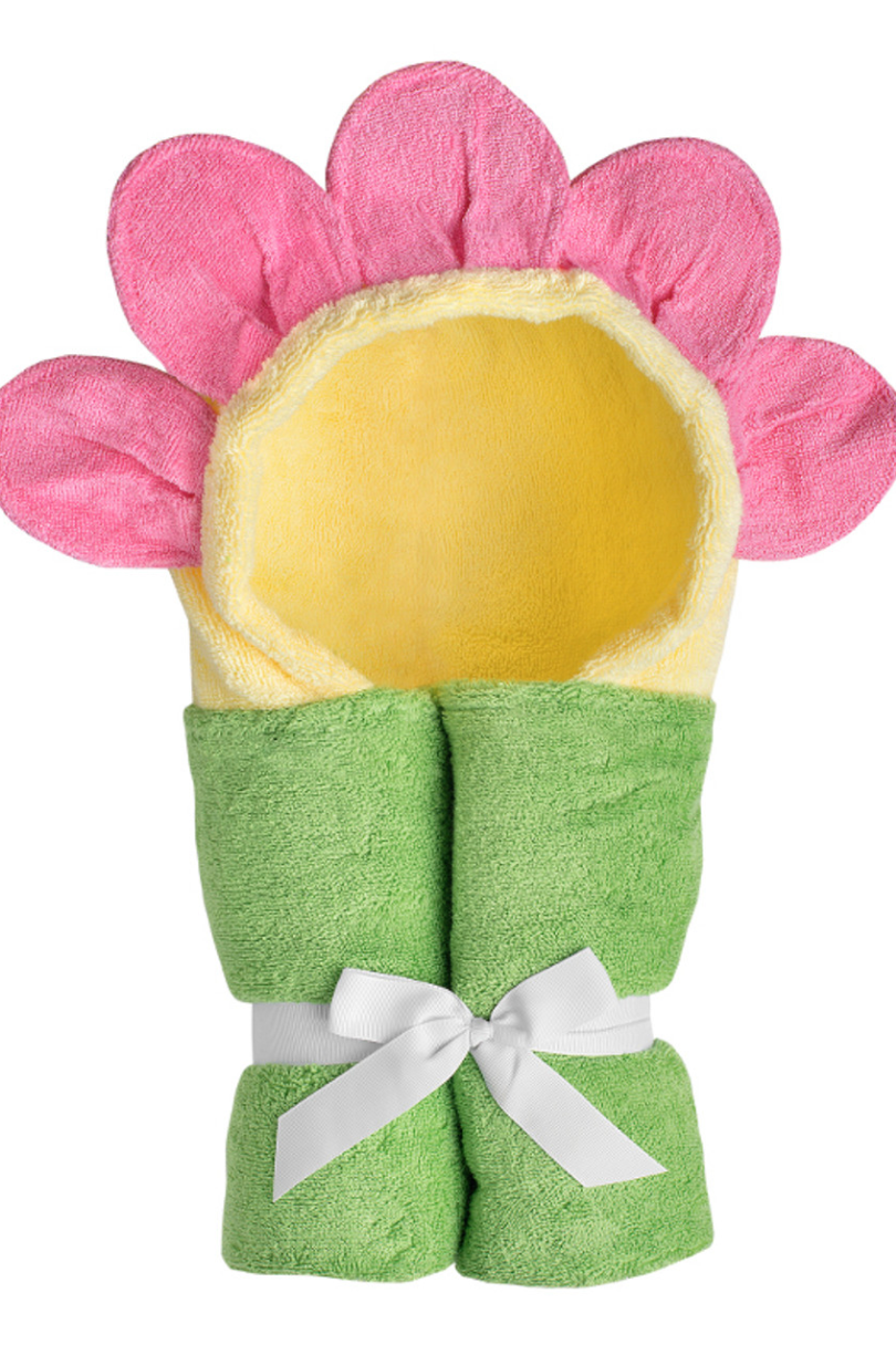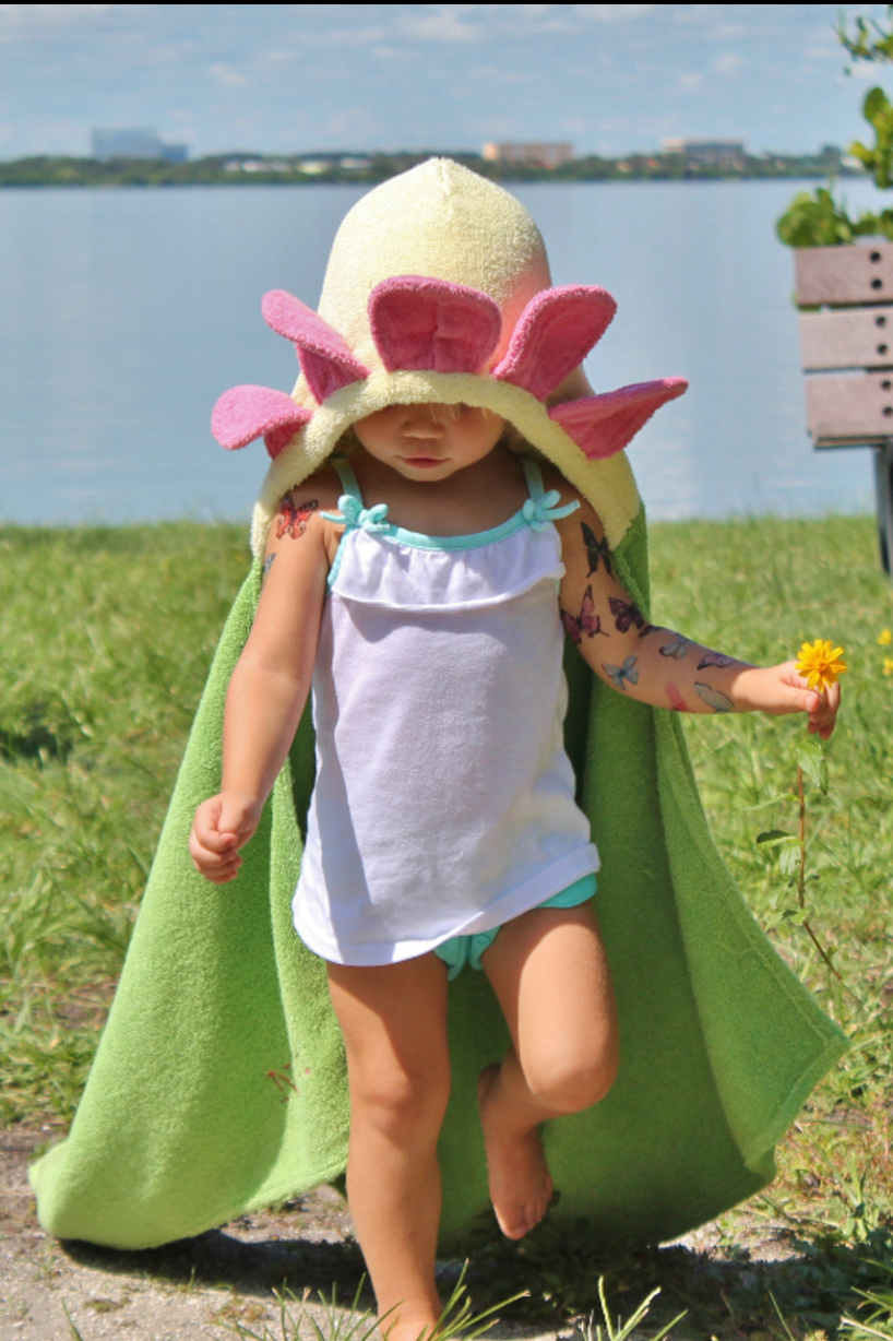 Crafted from luxuriously soft pink, green, and yellow terrycloth, this towel feels like a gentle hug from a field of flowers. Fiona Flower stands out like a petunia in an onion patch, making it a charming and unique gift for toddler girls or newborn babies. Perfect for the bath, beach, or pool, this towel adds a touch of fun and comfort to any water activity. With a practical size of 27"x51" and a hood measuring 10"x8.5", it's suitable for children aged 2 to 8 years. Plus, the small pockets on the top corners are designed for little hands to easily hold and wear, making it even more delightful!