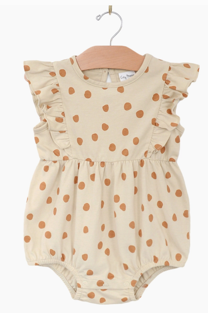 Our favorite flutter sleeve short romper in 100% cotton combed jersey gets an update in saffron dots print, just in time for the warmer weather! The perfect spring romper with flutters at the shoulders and snaps at the crotch for easy changing.