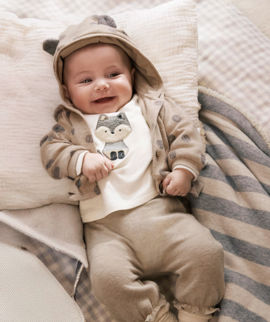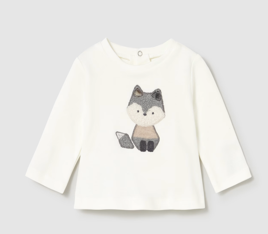 The Fox Top & Pant Set features a charming white long-sleeved T-shirt crafted with a soft round neckline and an eye-catching fox applique on the front, adding a playful and stylish touch.