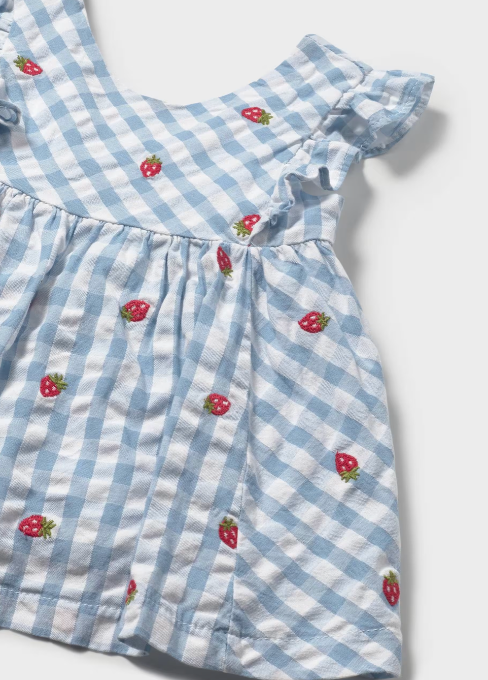 Featuring a classic gingham pattern adorned with strawberry motifs, the dress showcases delicate ruffle shoulders that add dimension and movement.