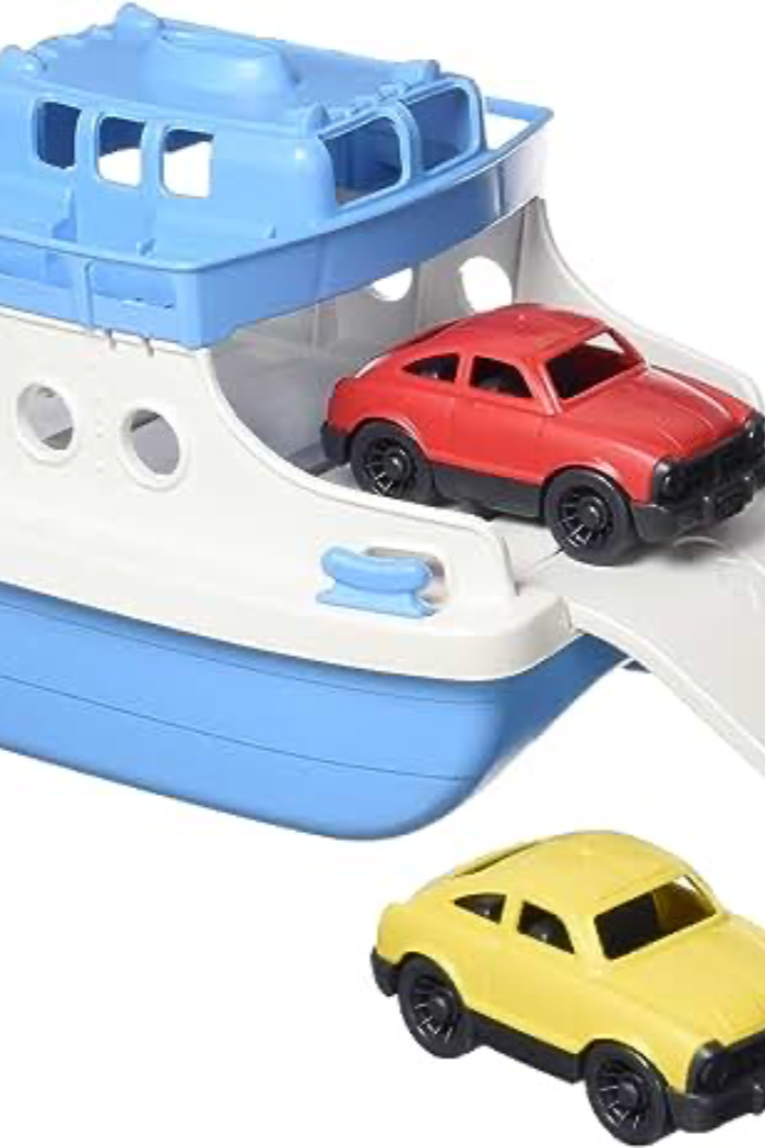 Green toy ferry boat with 2 mini cars. Ages 3+