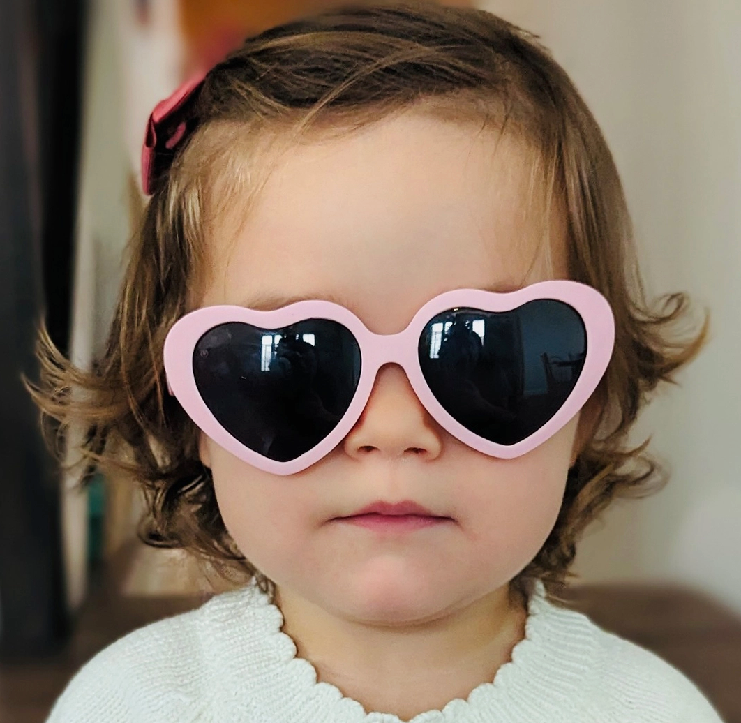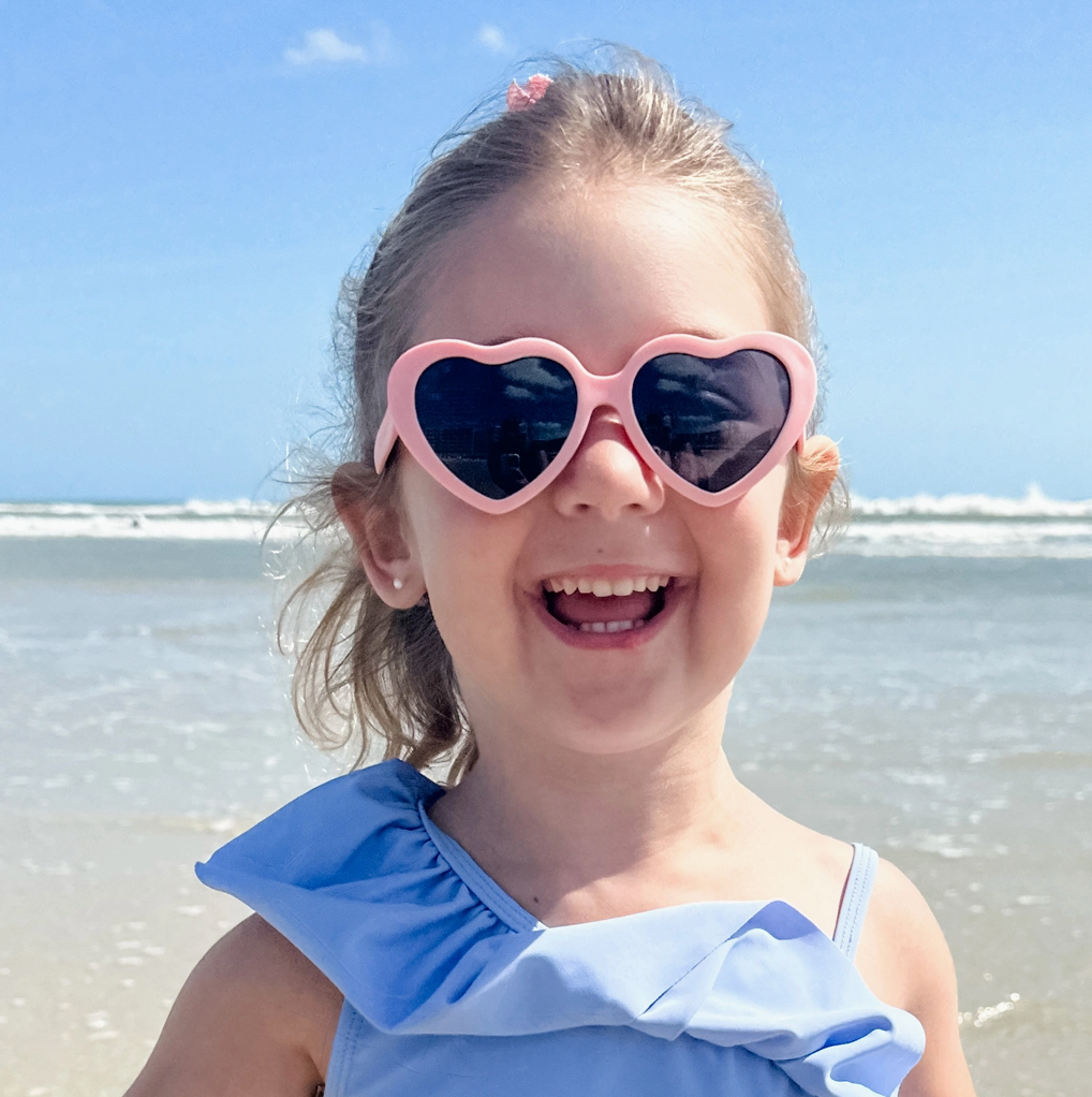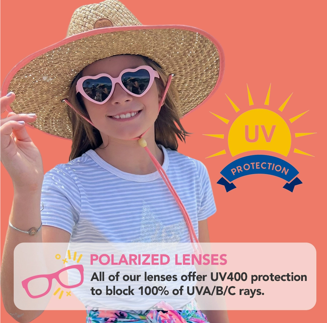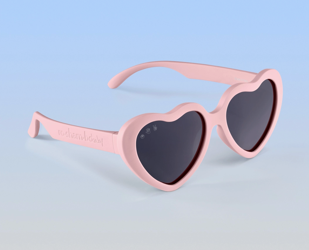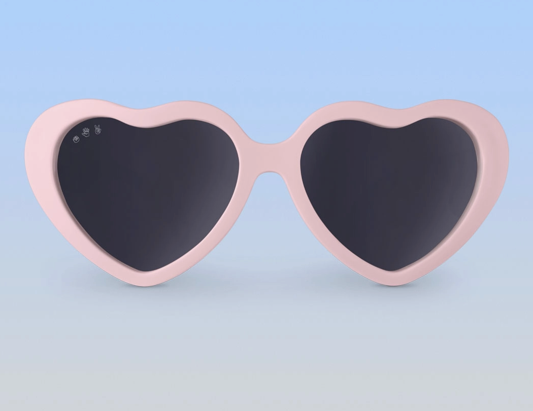 Heart style sunglasses in peachy pink with polarized lenses: + 100% UVA/B/C protection and shatter resistant, with added glare reduction to reduce eye strain and protect your eyes. + Made in Italy like your designer shades, and assembled in USA. + Nearly indestructible: we offer a full damage and lens replacement guarantee. + Certified BPA, lead, and latex free. Small parts tested as safe for babies.