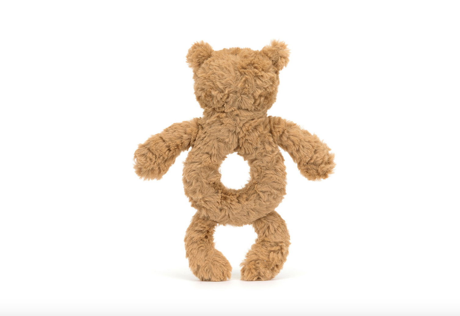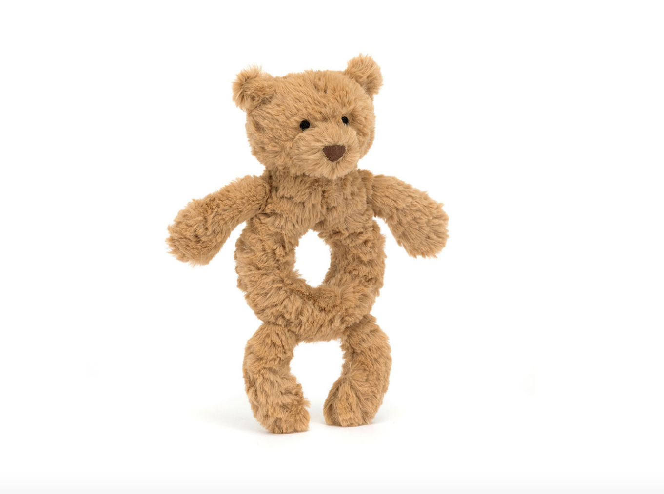 A timeless character for curious newborns, easy to grab by any one of his four paws or round tummy and gently jangle. This loveable cub has a rich, soft textured biscuit coat, made with recycled fibres and features his signature chocolate nose and rounded ear