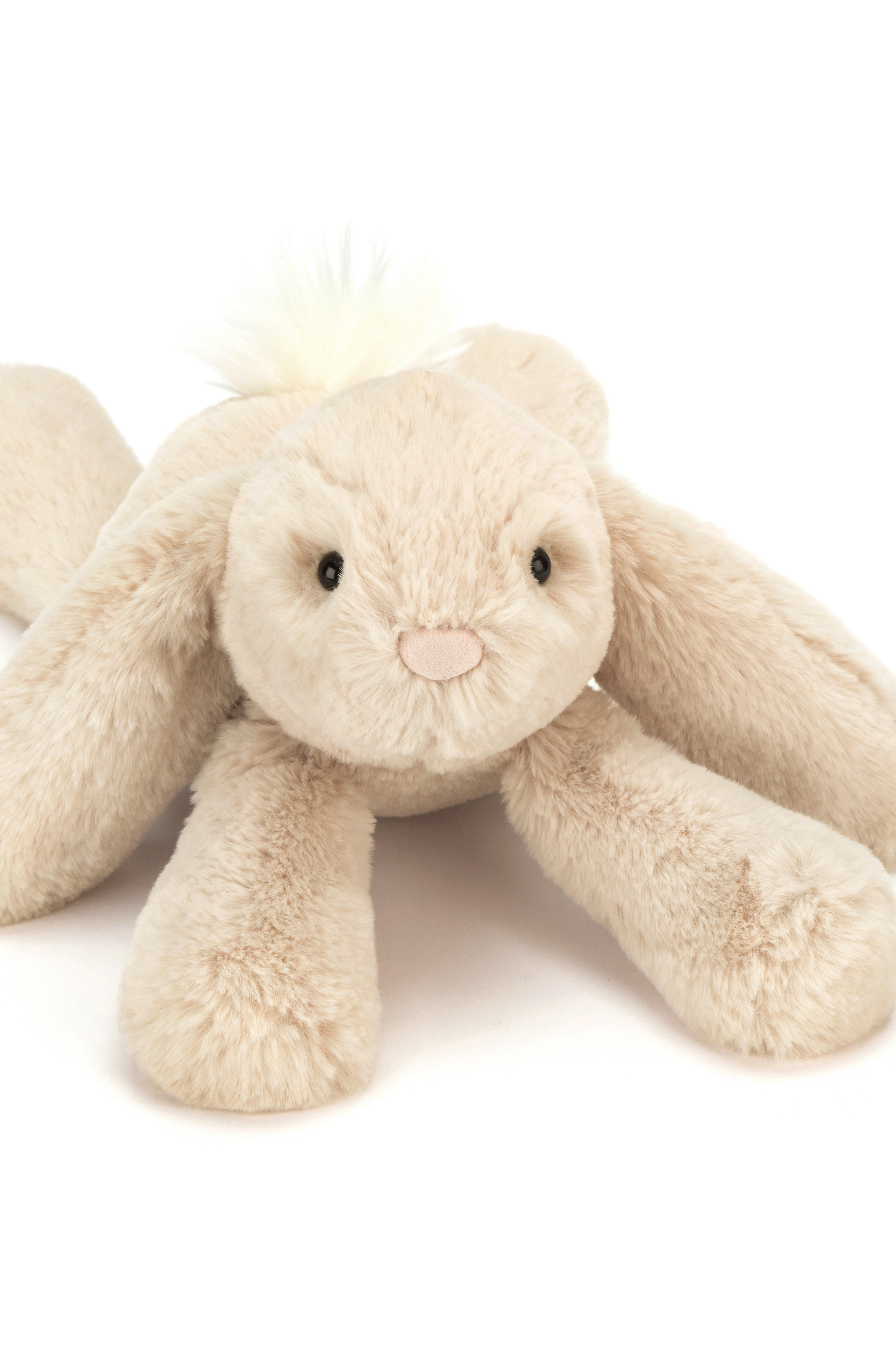 Smudge Rabbit is such a sleepy sweetie - always sprawling out, lazing on the bed or rug! Scrumptiously soft in oatmeal fur, this lop-eared lazer just captures the heart. An incredibly lopsy and loving companion, Smudge is a great gift for any bouncing baby. Bonnets and bobtails - we like it!
