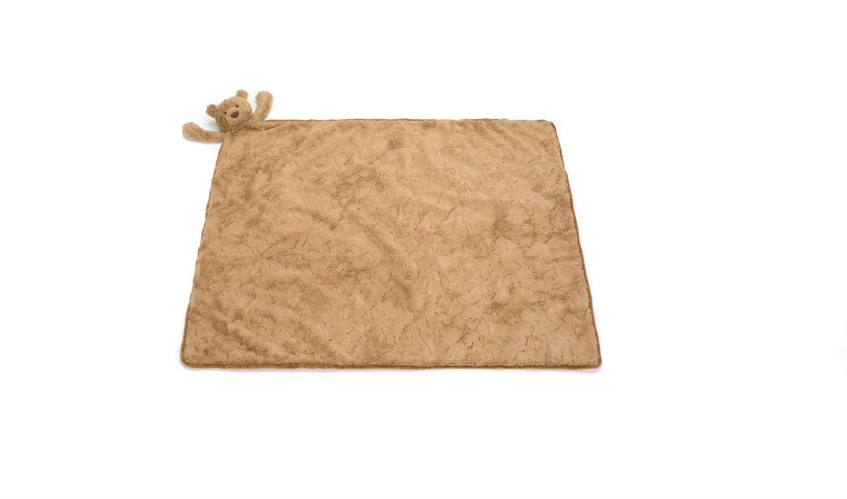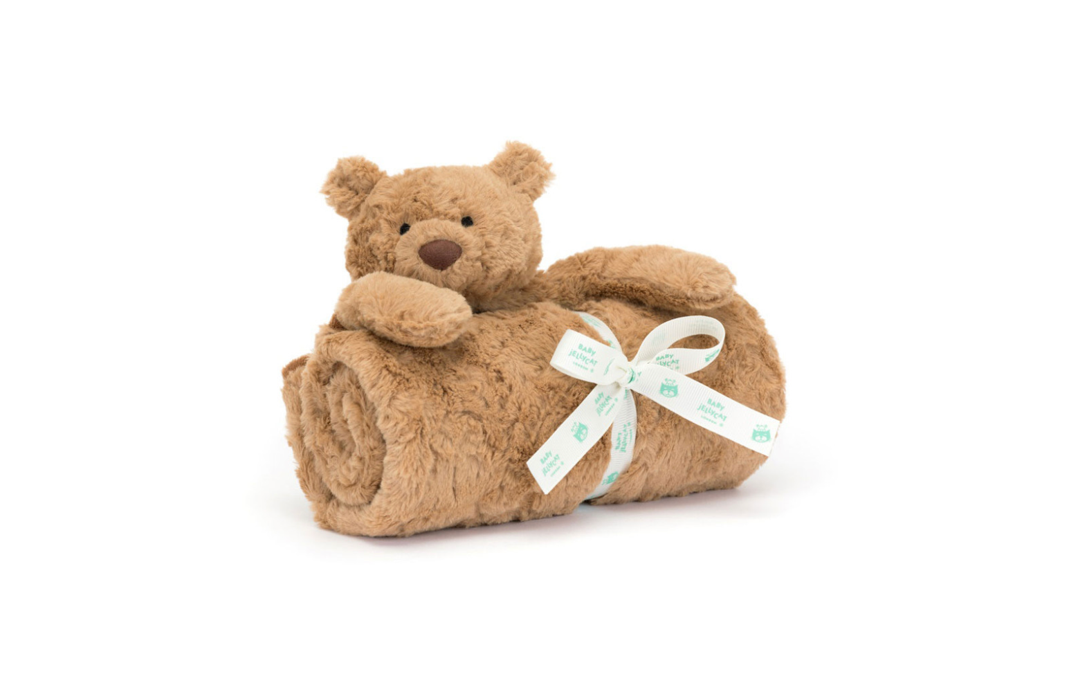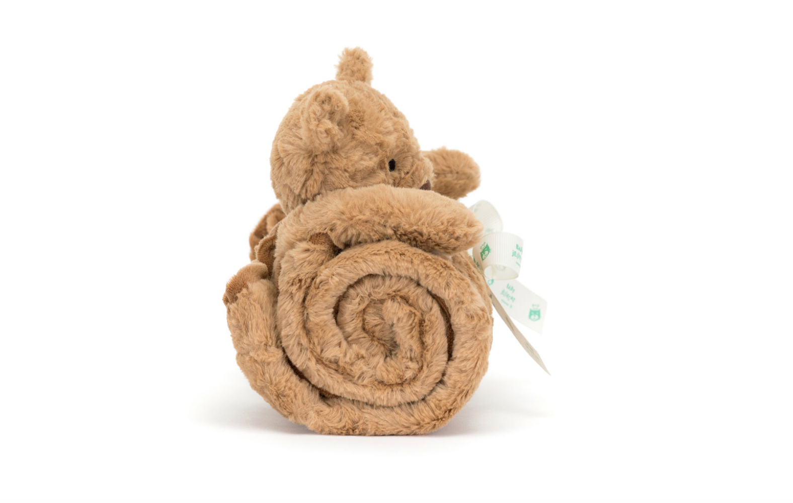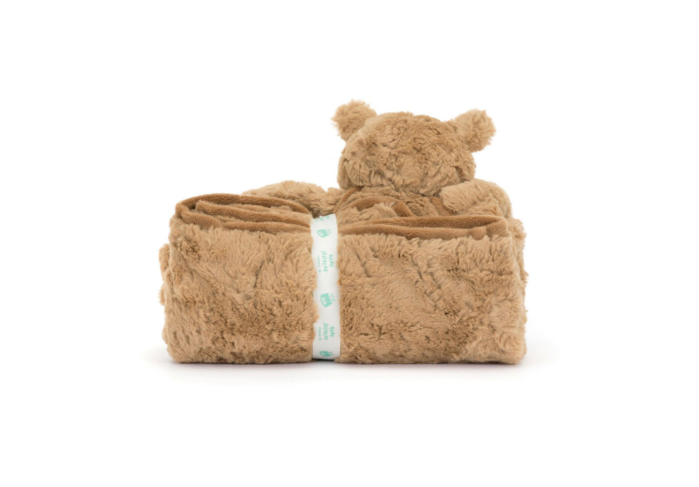 The Bartholomew Bear Blankie is a gorgeous gift of gently textured softness, featuring our most loved bear, rolled and presented in a Baby Jellycat grosgrain ribbon. Made with recycled fibres, this soft blankie has Bartholomew Bear’s gently rounded head and ears and outstretched arms peeking over the edge ensuring a favourite friend is never far away