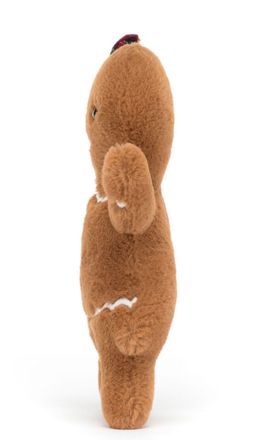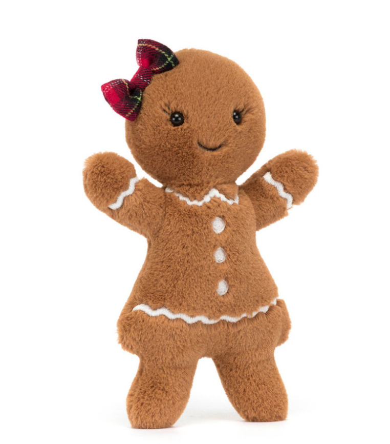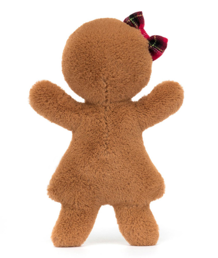 Jolly Gingerbread Ruby can't wait for Christmas! She's all glammed up in a stitched icing dress and her cosy fur is baked to perfection. With embroidered lashes and a tartan hair bow, and biscuit arms aloft, Ruby shines!