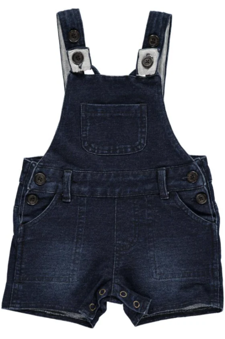 Navy loop back jersey shortie dungarees with snaps. 2 button closure on sides, adjustable straps with snap closure on legs. Cute bib pocket on front and two rear pockets. Very soft and stretchy.