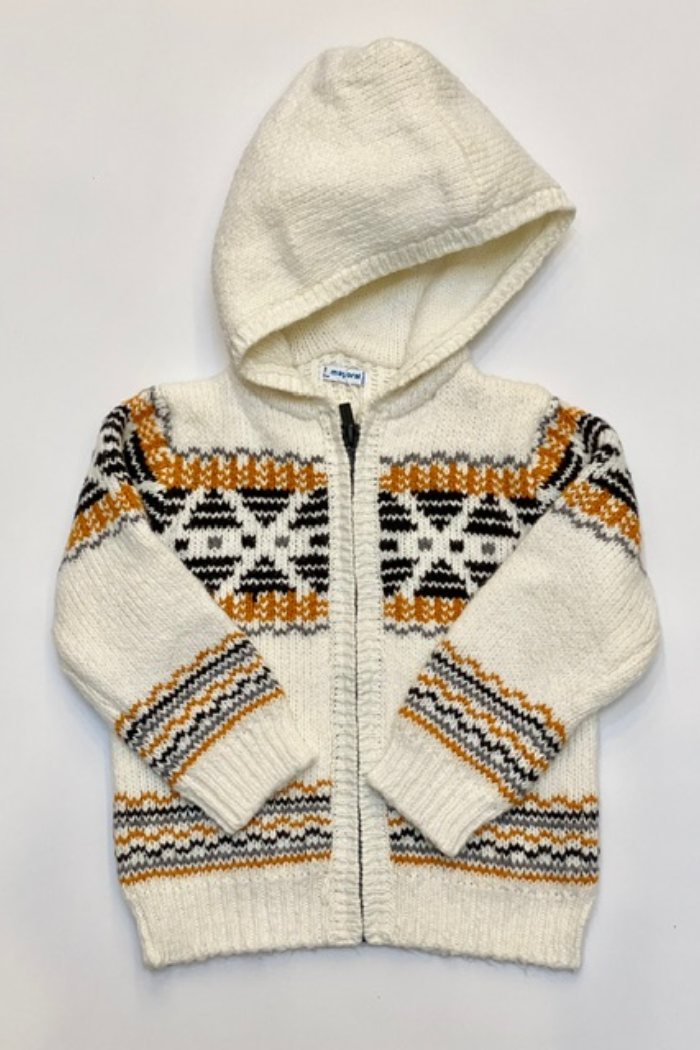 Woven knit sweater for girls. Collar with hood. Front zipper. Thick knit fabric, warm and soft.