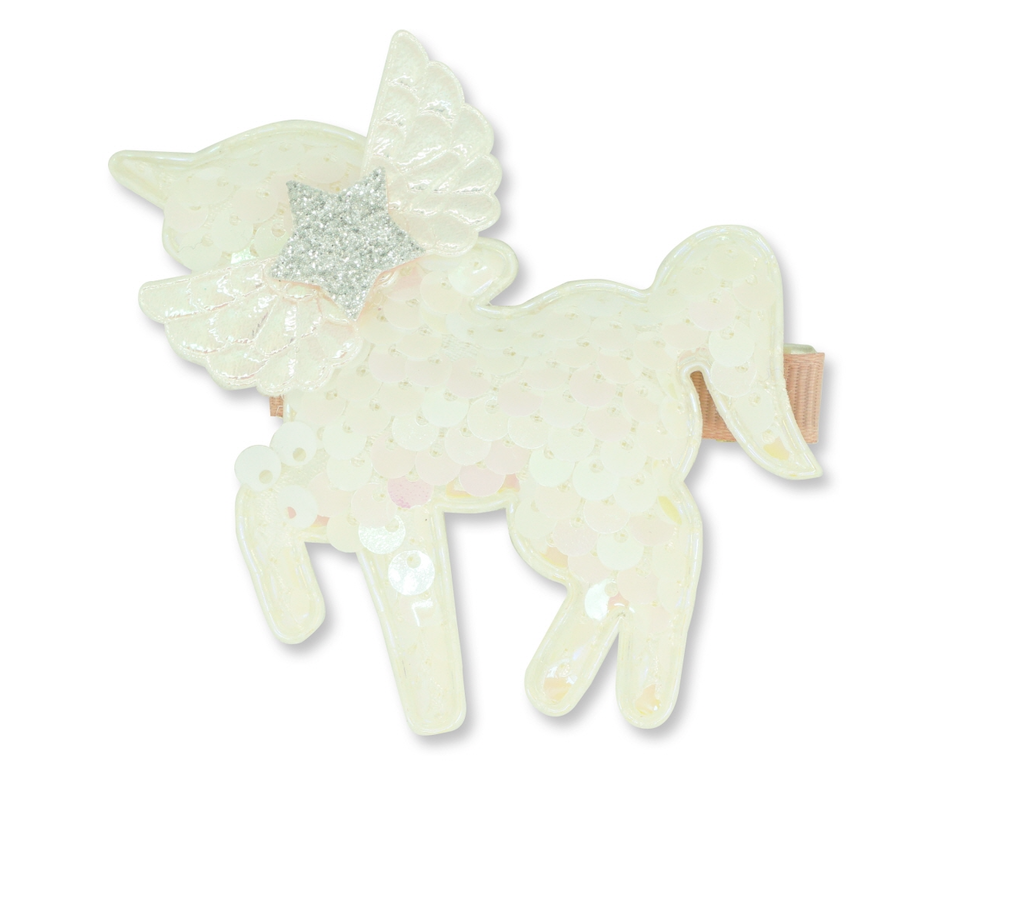Large Unicorn Glitter Hair Clip. Light pink clip, white sequinned unicorn with silver star.